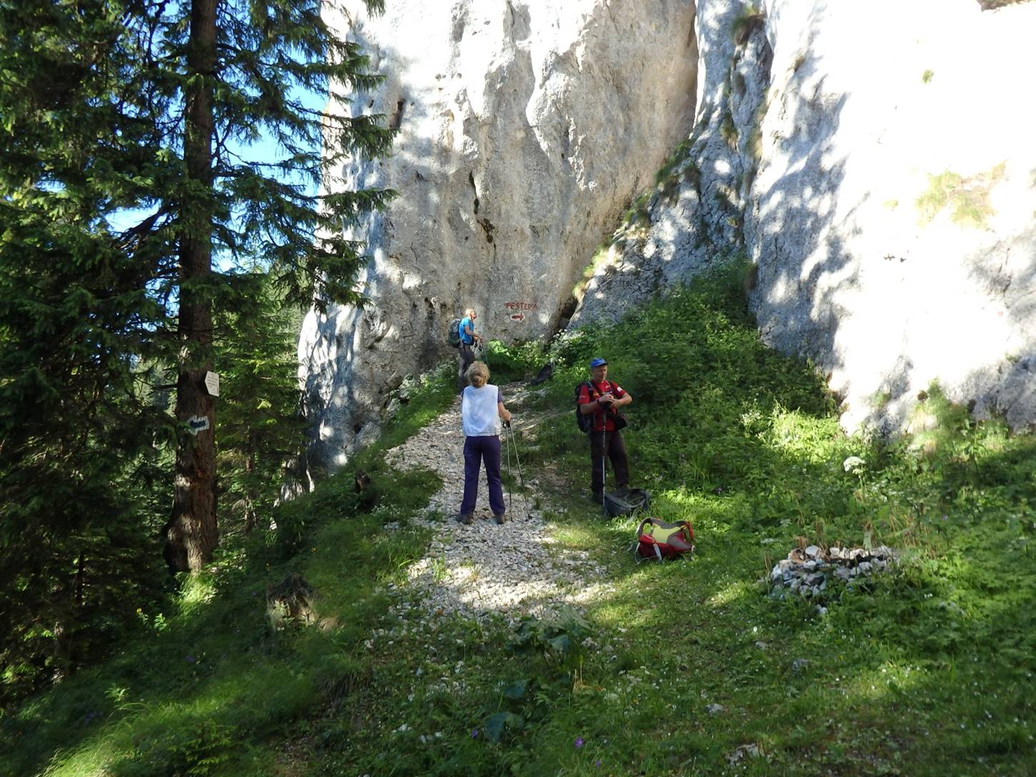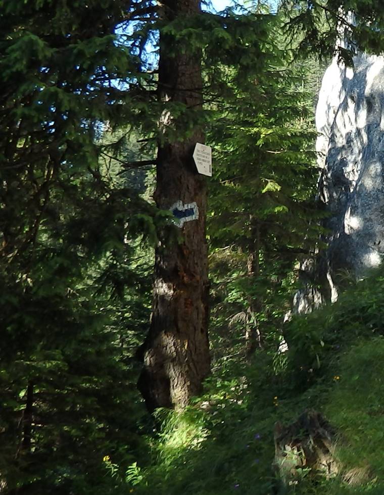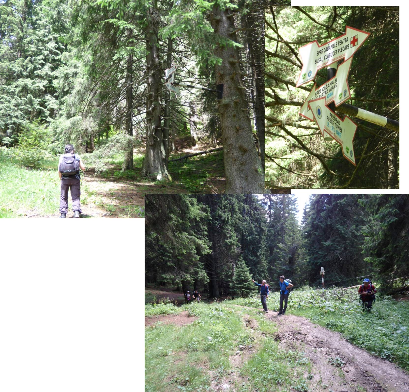 O placă informativă a Salvamontului Săcele ne atrage atenția că traseul “bandă albastră” este impracticabil de la peșteră spre Săcele din cauza arborilor doborâți de furtunile recente ! Cum nu avem alternativă, noi vizând valea Gârcinului, ne asumăm riscul și … mergem înainte … la vale; …