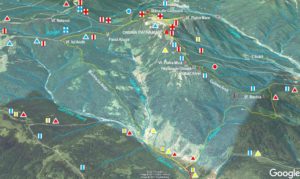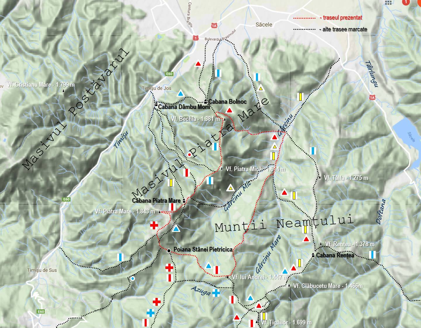 … cea roșie coboară în valea Timișului, la Dâmbu Morii; cea albastră duce, trecând pe la Peștera de Gheață, la Cabana Bolnoc (și nu Bunloc), ajungând la Săcele (și nu la Dâmbu Morii cum s-ar putea înțelege de pe indicatorul din poiană; dar, de la Cabana Bolnoc, se poate coborî, la Dâmbu Morii pe “triunghi albastru”). Punctul roșu ne va apare cu puțin înainte de a ajunge la Peștera cu Gheață !