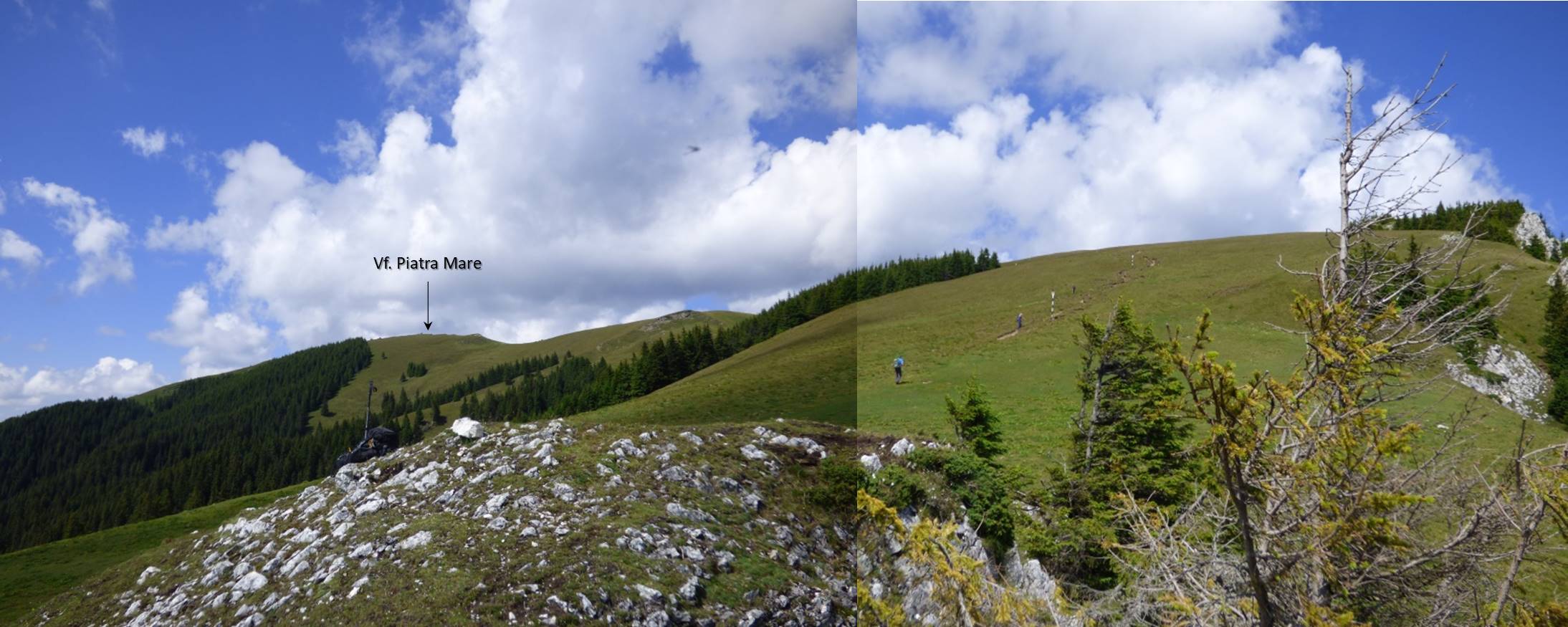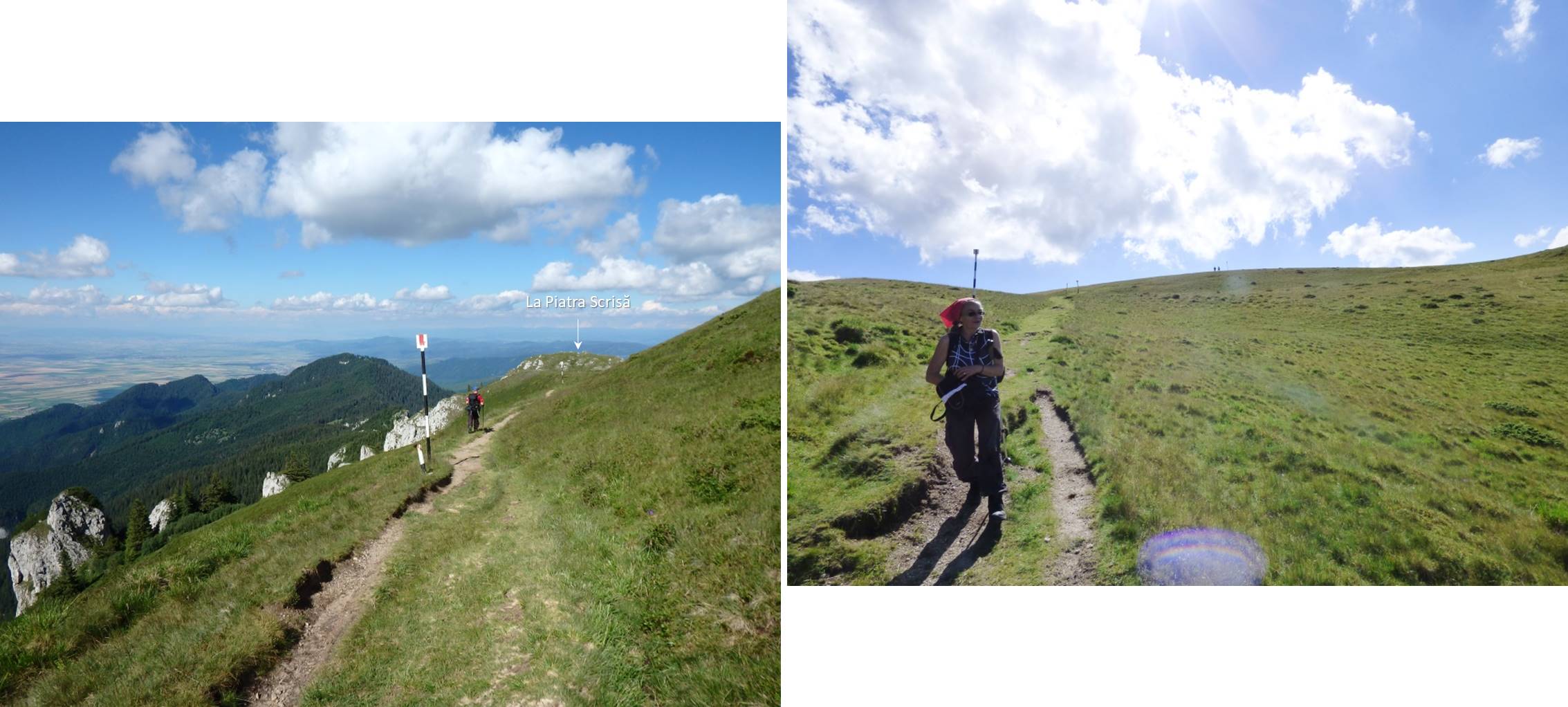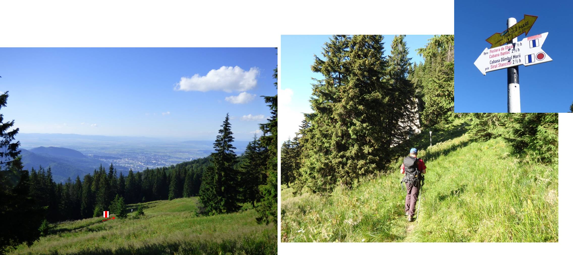 “Crucea roșie” se desparte aici (temporar) – și noi la fel – de “triunghiul albastru”, acesta din urmă ducând spre Cabana Piatra Mare pe sub abruptul estic al platoului alpin al Pietrei Mari (Piatra Scrisă – dincolo de care cele două marcaje se reîntâlnesc).
