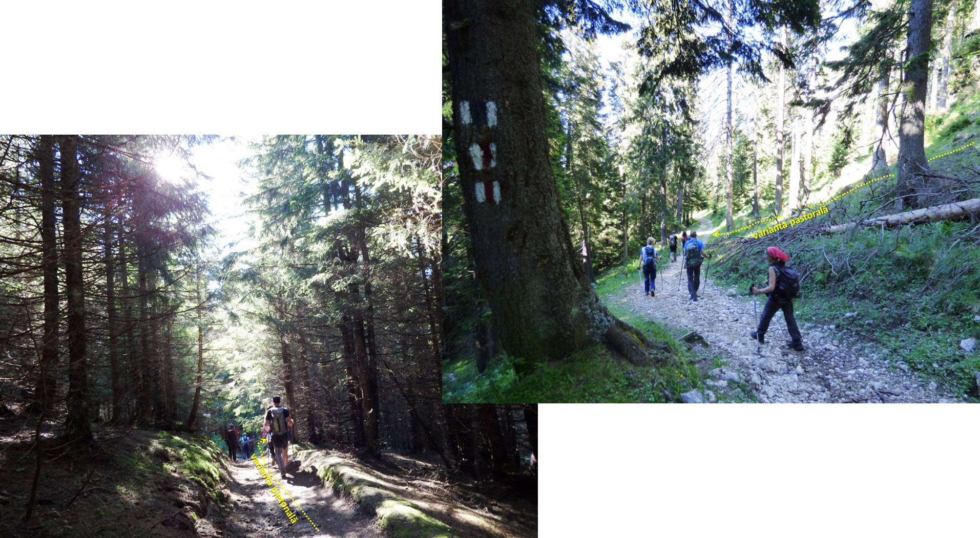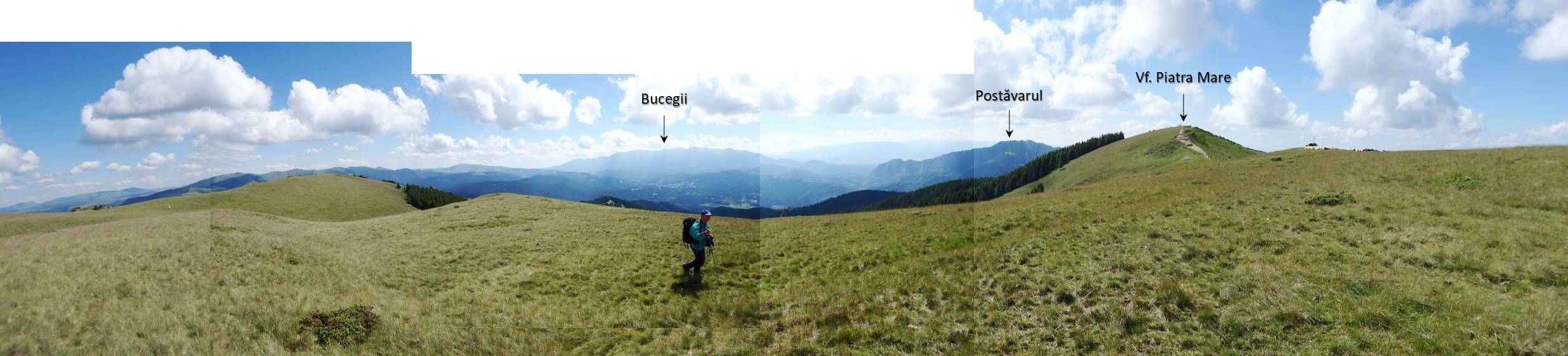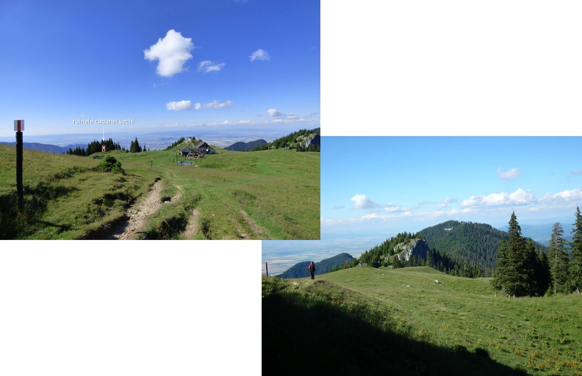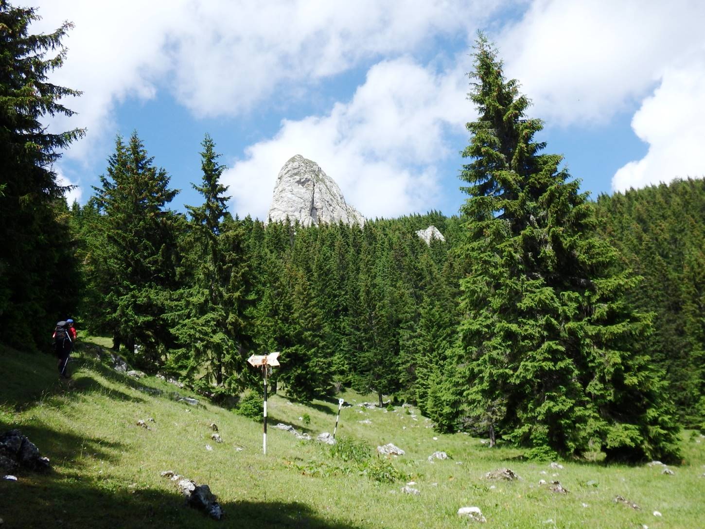 “Crucea roșie” se desparte aici (temporar) – și noi la fel – de “triunghiul albastru”, acesta din urmă ducând spre Cabana Piatra Mare pe sub abruptul estic al platoului alpin al Pietrei Mari (Piatra Scrisă – dincolo de care cele două marcaje se reîntâlnesc).