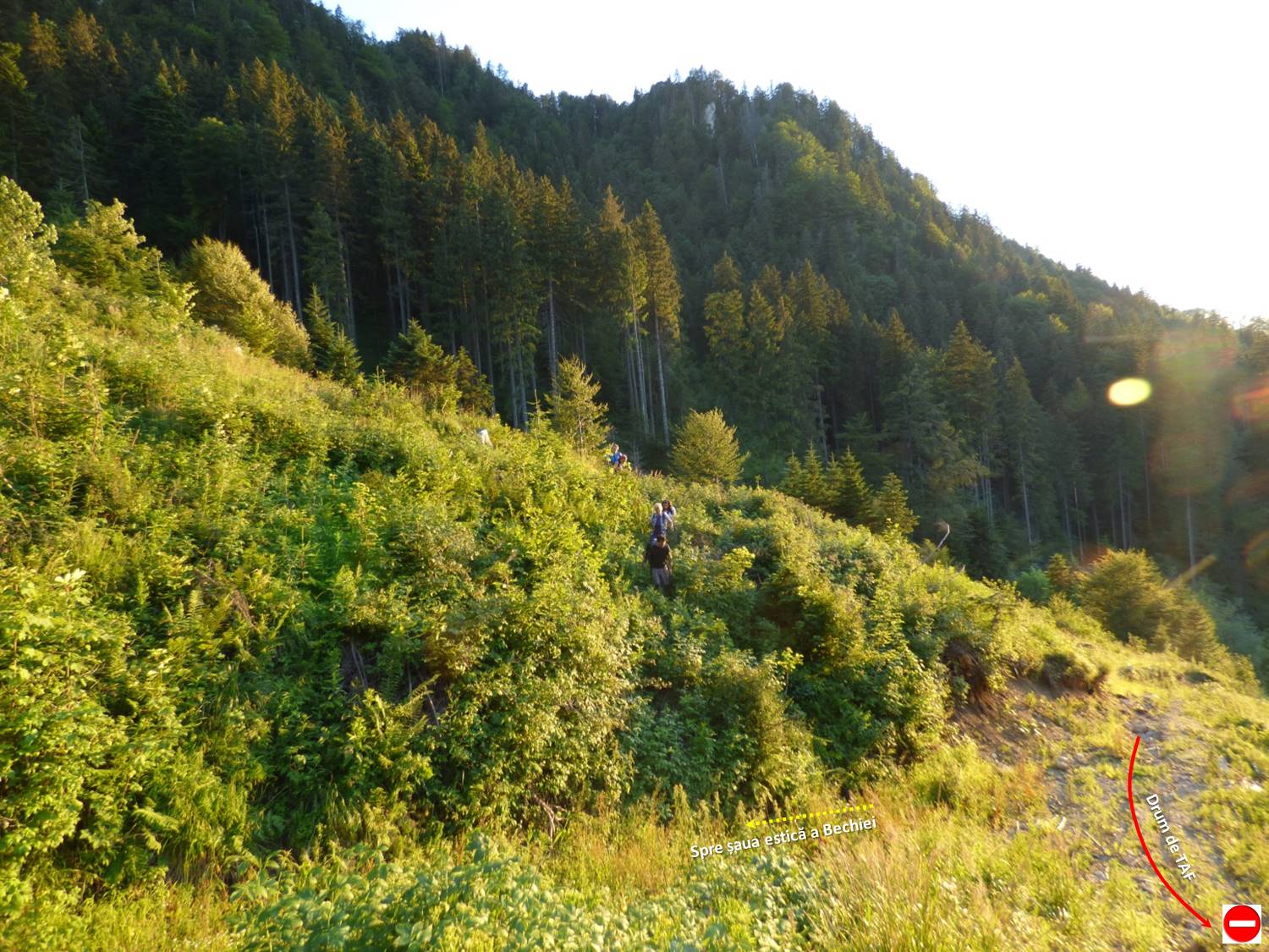 … care se termină printr-o șa joasă, dincolo de care se înalță, impresionant, piramida Vârfului Bechia (19:30) ! Poteca marcată îi taie toate coastele vestice, în general coborând, mult sub punctul somital – deci larg – până în șaua de pe versantul nordic al vârfului, unde se află punctul de unde vom coti spre valea Mușatului (dar într-o fază ulterioară). Numai că, în valea Mușatului se poate ajunge direct, coborând din șaua sudică a Bechiei, evitând marele ocol pe care îl fac, încă, actualele trasee marcate (precizări, imediat) !