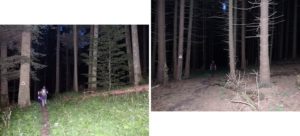Trei sferturi de oră a durat traseul de-a lungul Mușatului (marcaj rar, relativ deficitar – pentru condițiile de noape) până la drumul de pe valea Gârcinului; la 23:00 suntem la mașini !