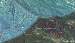 Mai facem jumătate de oră – la lumina lanternelor – până la apa Mușatului (marcaj bun). Dacă am fi știut de posibilitatea scurtcircuitării traseului prin șaua sudică a Bechiei am fi redus cele 2 h și 15 min pe care le-am făcut de acolo până în valea Mușatului la doar 30 min (pe cca 200 m diferență de altitudine și cca 600 m lungime) !