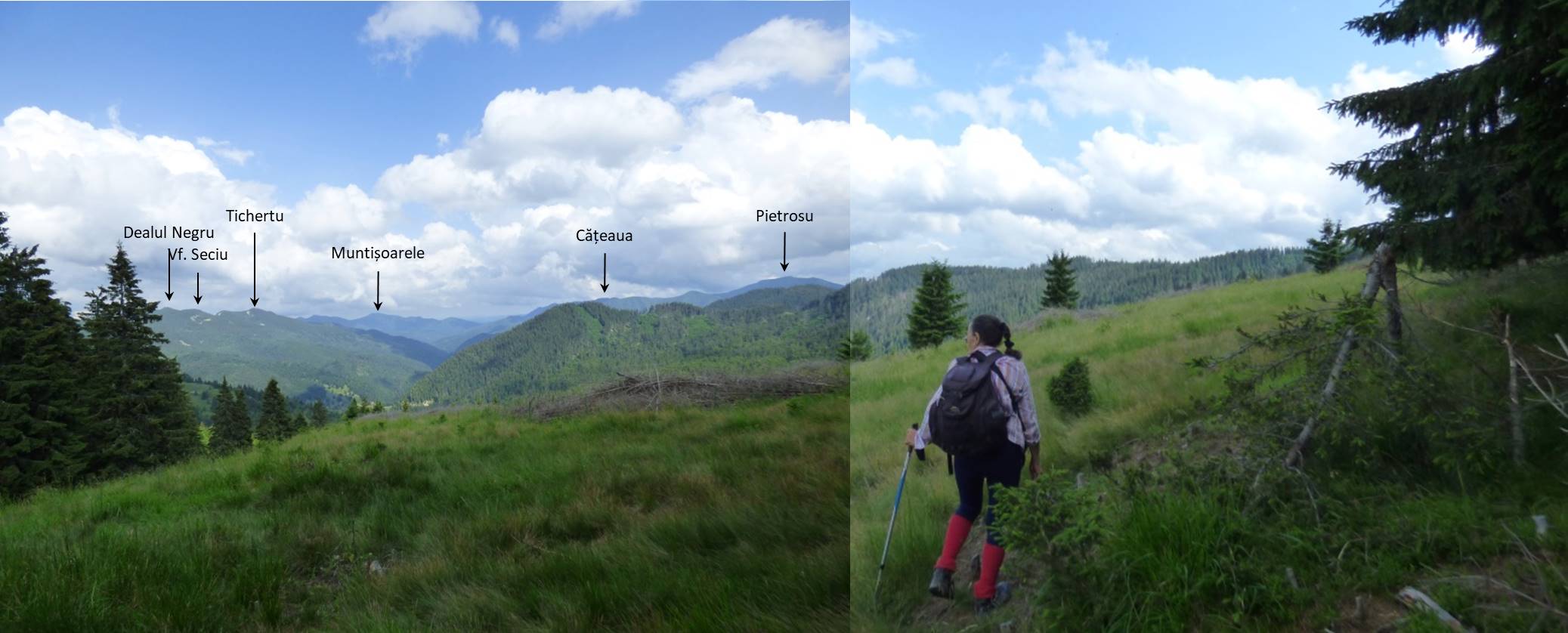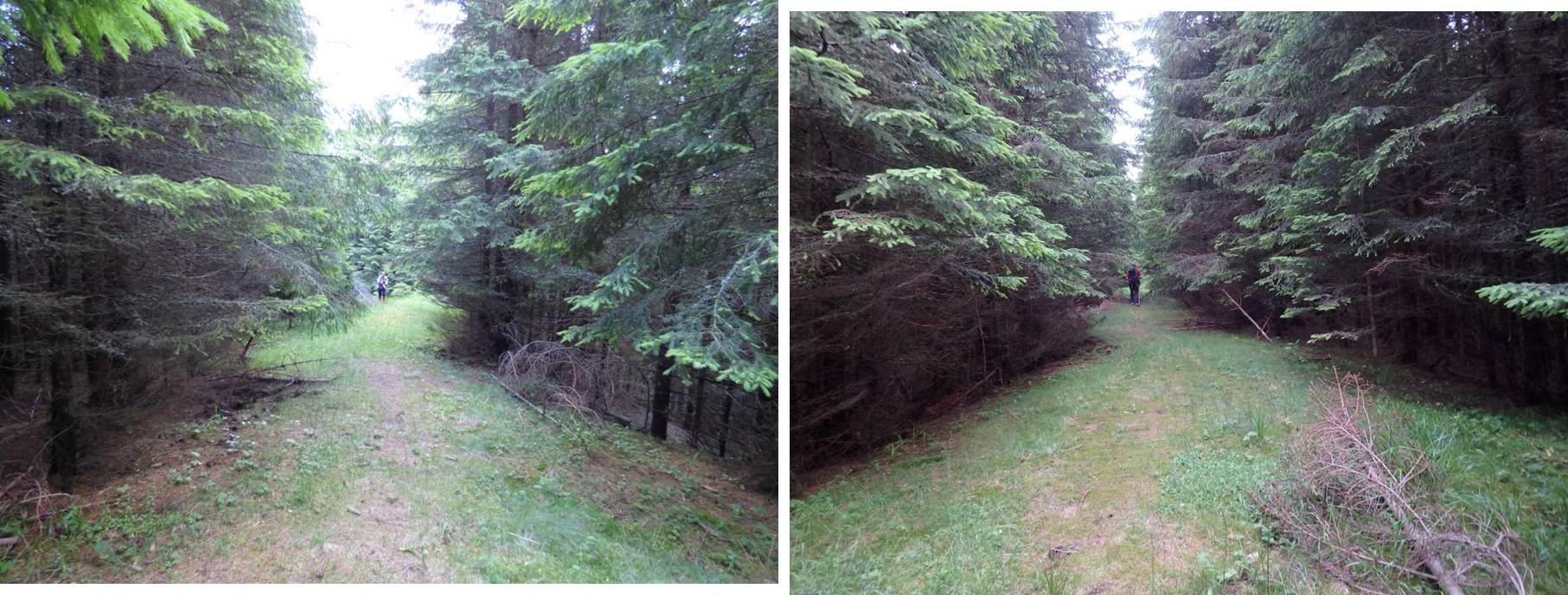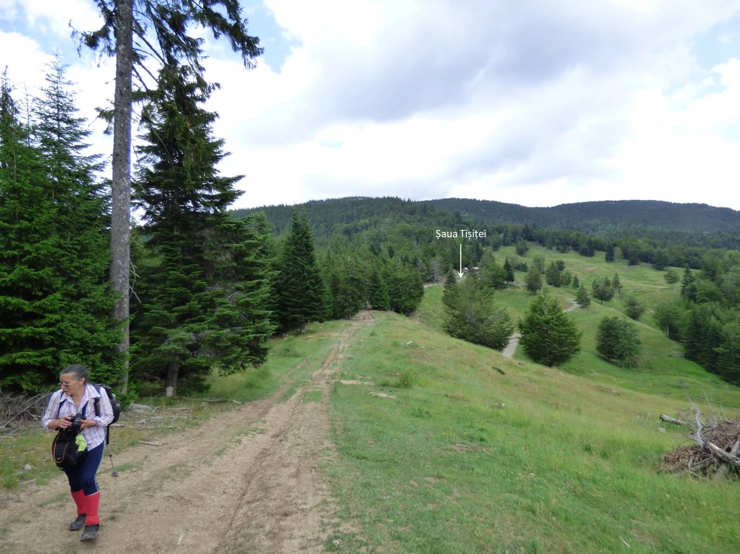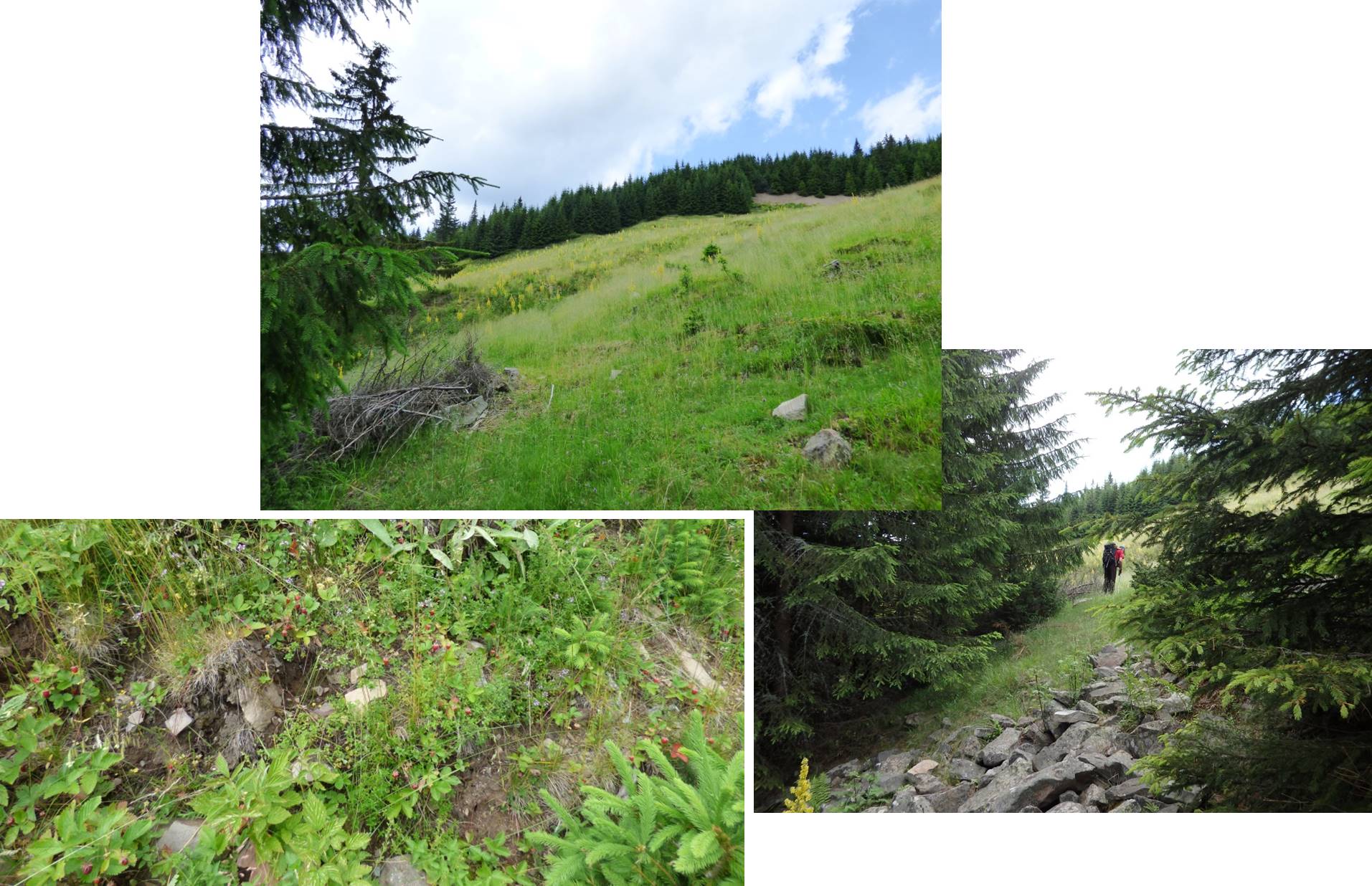 De cum ieșim într-o poiană largă, când se ostoiește și urcușul, părăsim drumul și deviem spre dreapta, pe deasupra obârșiei mlăștinite a unui vâlcel, pentru a-i prinde, ceva mai sus, traversând câteva rariști printr-un molidiș tânăr, interfluviul ce-i formează versantul stâng.