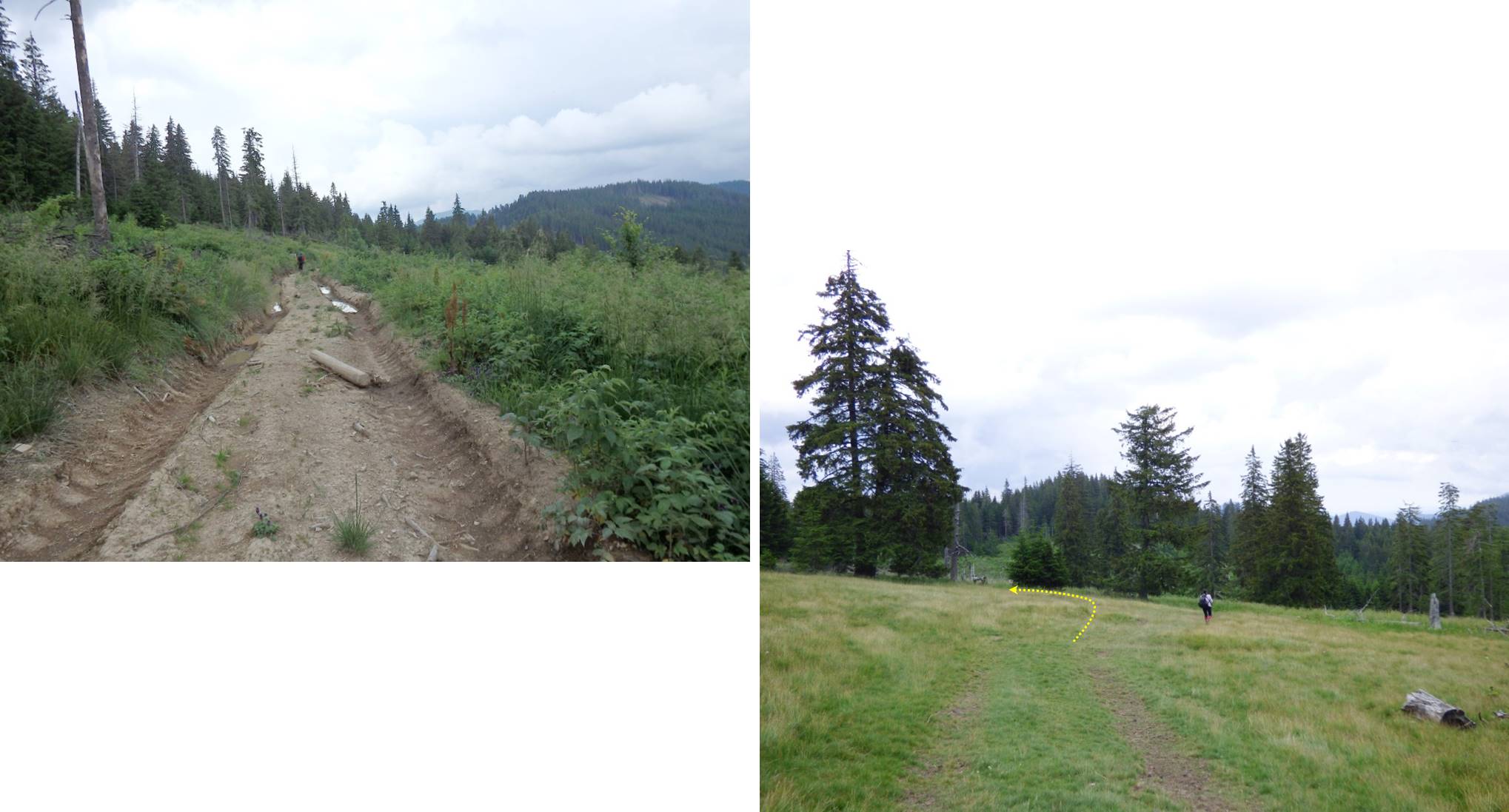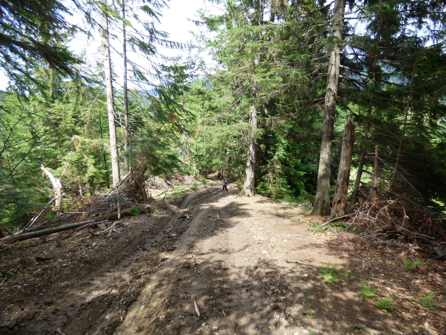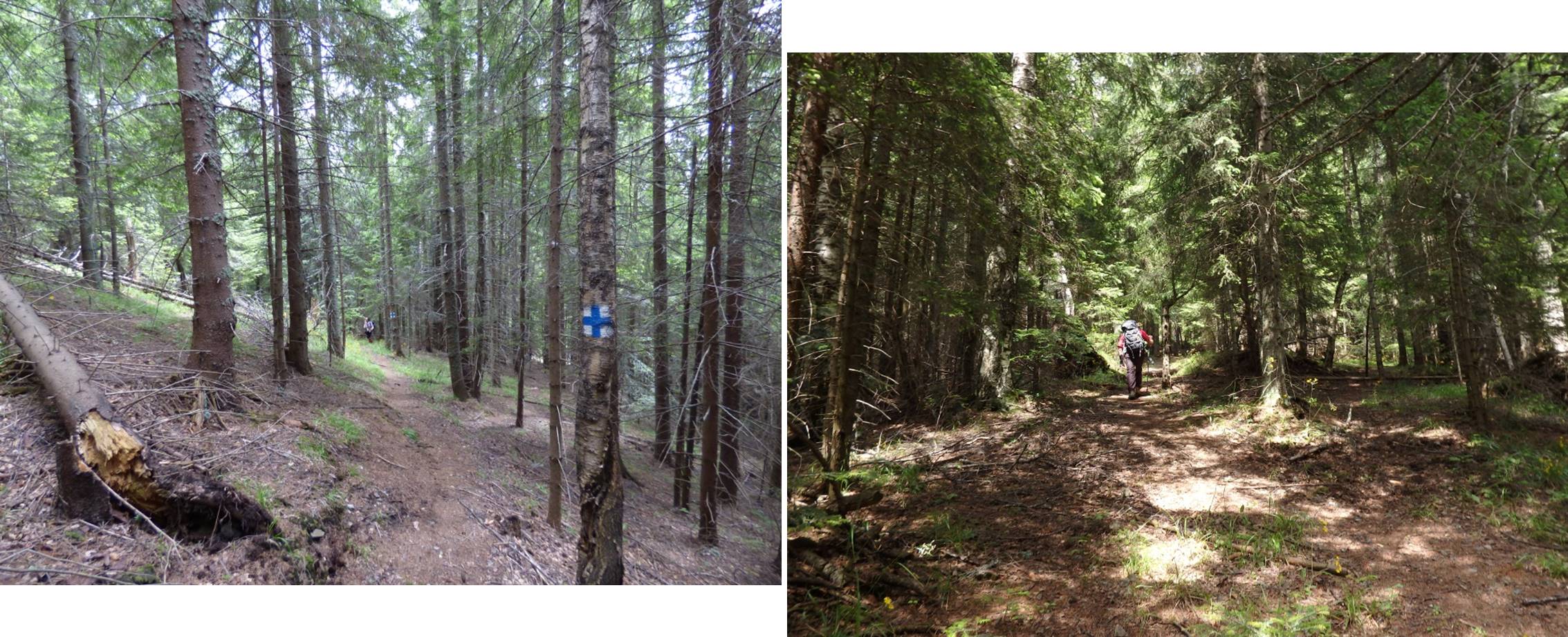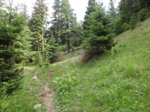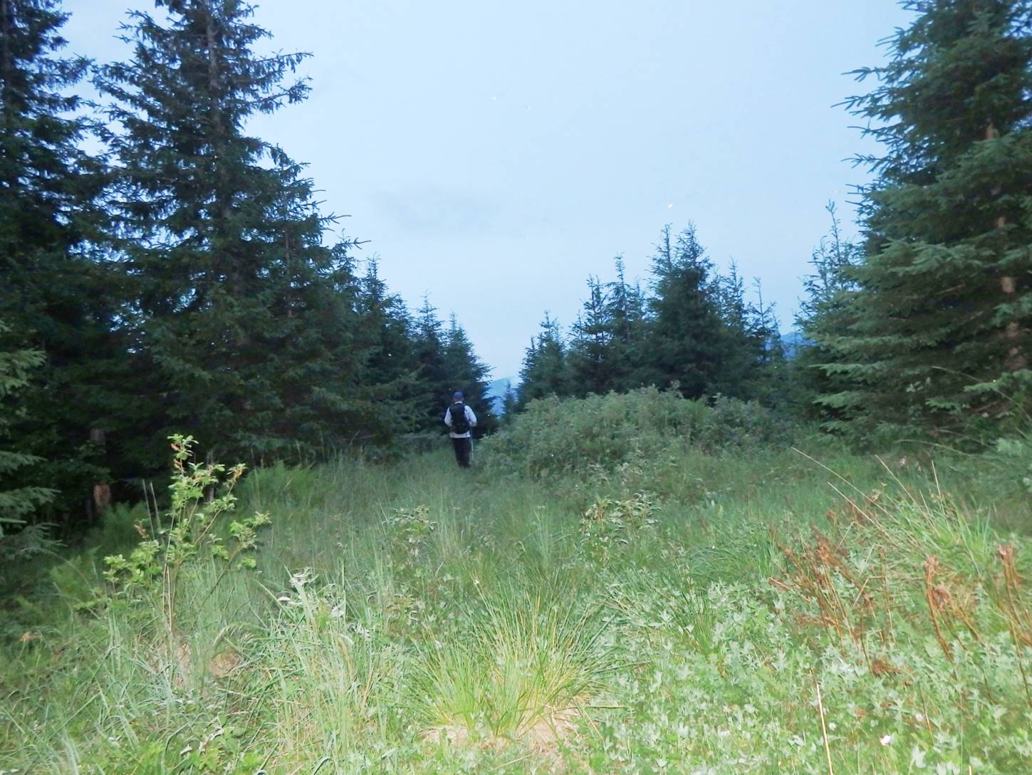 De cum ieșim într-o poiană largă, când se ostoiește și urcușul, părăsim drumul și deviem spre dreapta, pe deasupra obârșiei mlăștinite a unui vâlcel, pentru a-i prinde, ceva mai sus, traversând câteva rariști printr-un molidiș tânăr, interfluviul ce-i formează versantul stâng.
