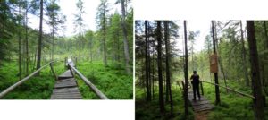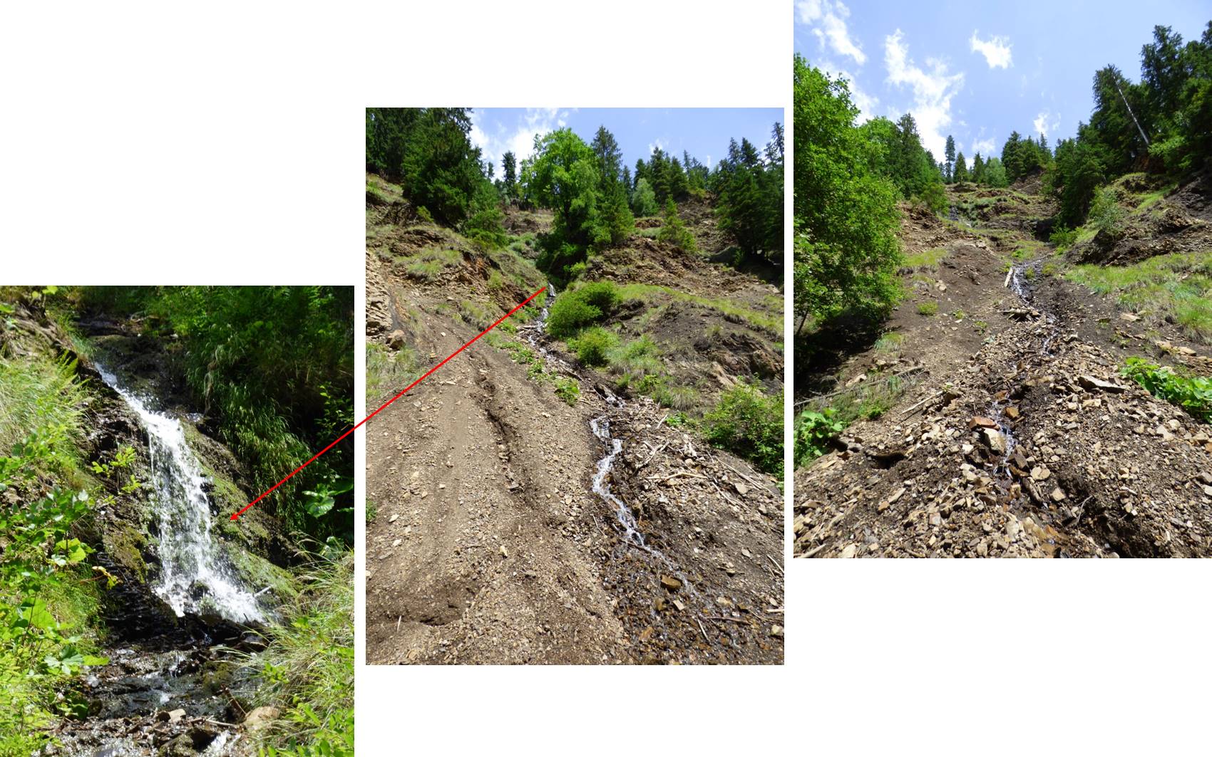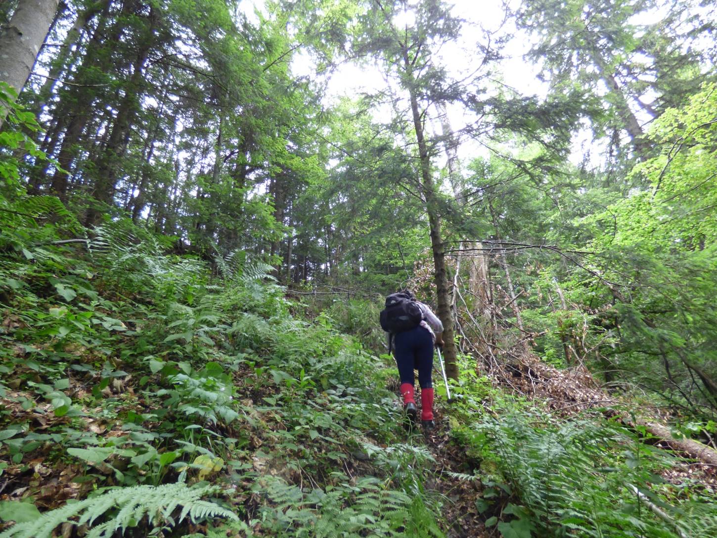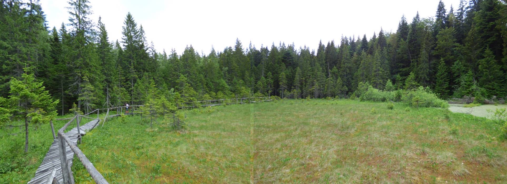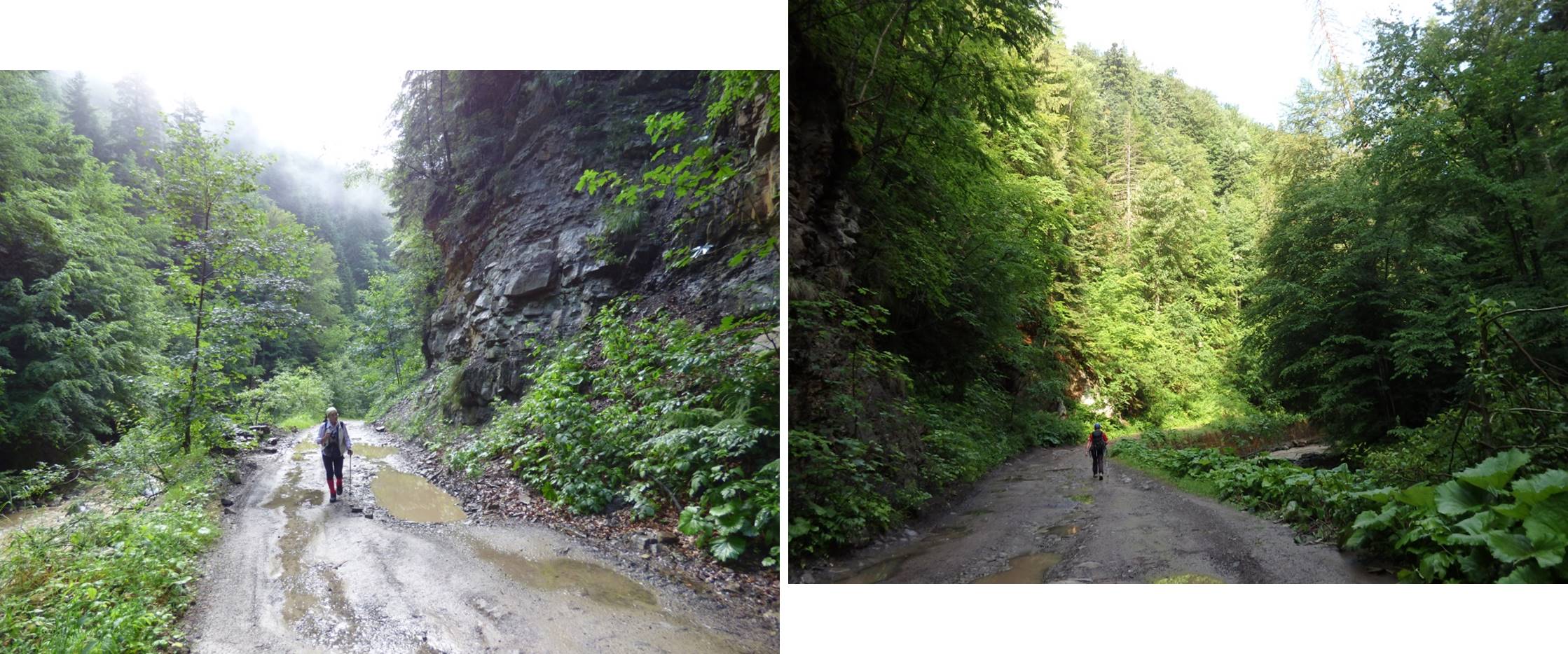 De cum ieșim într-o poiană largă, când se ostoiește și urcușul, părăsim drumul și deviem spre dreapta, pe deasupra obârșiei mlăștinite a unui vâlcel, pentru a-i prinde, ceva mai sus, traversând câteva rariști printr-un molidiș tânăr, interfluviul ce-i formează versantul stâng.