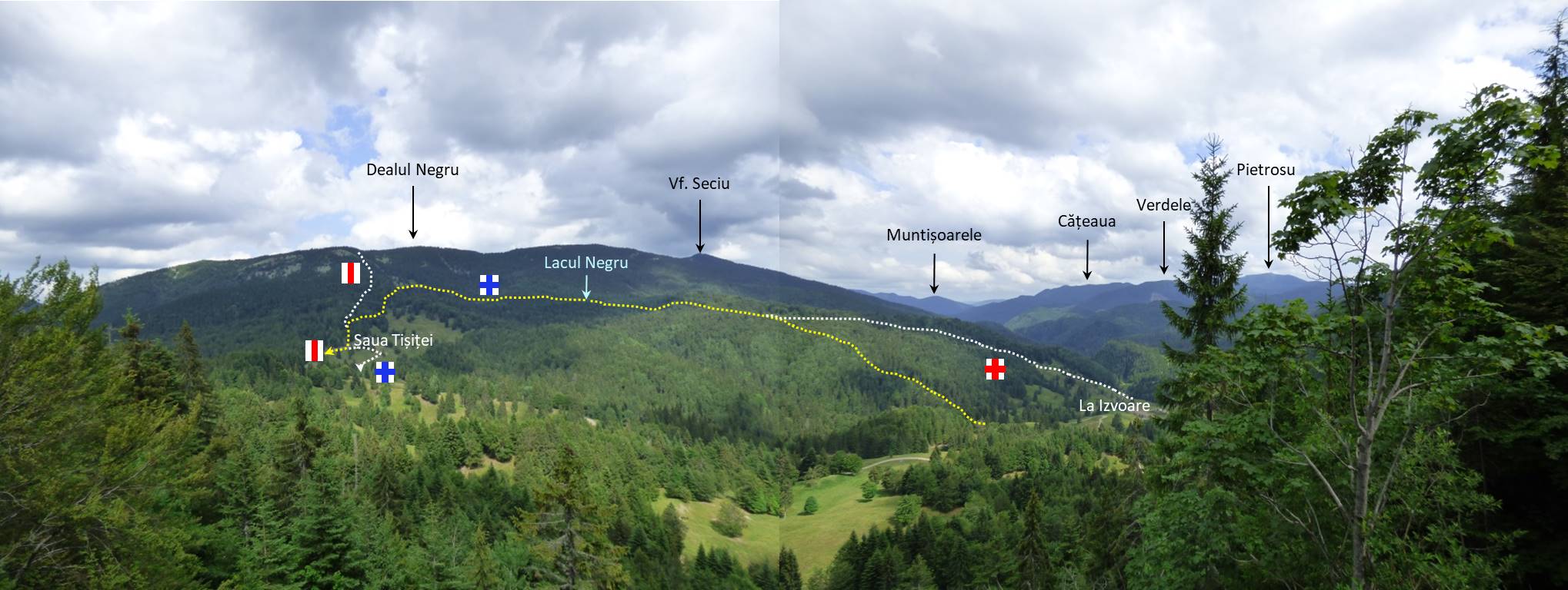 Traseu: Brădet/Nistorești (Gura Mișinei/Valea Nărujei) – Valea Nărujei – Cantonul/Poiana Izvoare [cruce albastră] – Lacul Negru [punct roșu dispărut] – Șaua Tișiței [cruce albastră] – Poiana Șindrilița – Culmea Păișelor – Vf. Pietrosu – Vf. cu Lespezi – Golul Pietrosului [bandă roșie (& cruce roșie de sub Vf. Pietrosu până pe Vf. cu Lespezi)] – Dealul Mortului – Gura Mișinei [punct albastru]