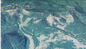 … ne-a mai trebuit o jumătate de oră să coborâm până în Golului Pietrosului, de fapt, până în marginea sa amonte unde am întâlnit un drum forestier (primul) direcționat spre stânga (nord) și pe care speram să descoperim marcajul punct albastru al traseului care urma să ne coboare pe Dealul Mortului în valea Bălosului și apoi la gura sa, vecină cu cea a Mișinei. N-am apucat să căutăm “punctul albastru”, a început brusc ploaia, lumina a scăzut și ea, parcă deodată, așa că am plecat repejor pe drumul … speranței; împlinită, căci primul punct albastru a lucit curând în raza lanternei. Coborârea ne-a luat exact trei ore, timp în care ploaia n-a stat o clipă, ba s-a mai și întețit, însoțindu-se cu tunete și fulgere; care chiar ne-au ajutat, căci, drumul, odată ajuns în valea Bălosului, se cam … pierde, și odată cu el și marcajul, vreo câțiva metri buni, dar exact atunci un imens fulger ne-a arătat pe unde iese drumul din apă ! Apropo de marcaj: dacă am reușit să ne ținem de el, în ciuda întunericului și a numeroaselor brațe laterale ale drumului principal, înseamnă că este excelent !