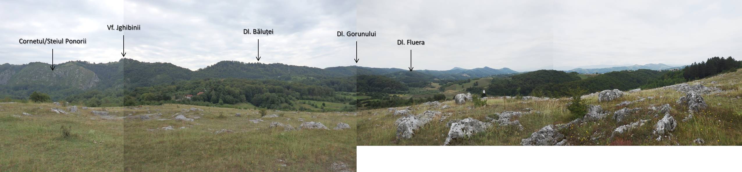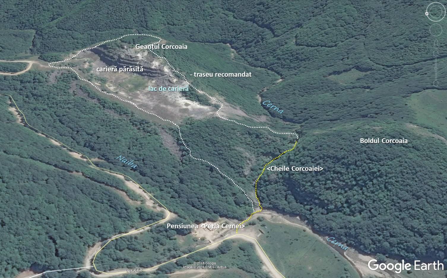 … deși am fi putut să completăm traseul prin chei cu o buclă exterioară pe unul dintre cele două corpuri ale Boldului Corcoaia, căruia noi i-am spus Geanțul Corcoaiei, și în care a fost săpată o carieră de calcar, acum părăsită. Locul a căpătat un caracter pitoresc, dat de prezența unui lac de carieră (probabil, temporar), oferta de peisaje fiind una generoasă (a se vedea, de exemplu, aici, aici și aici) !