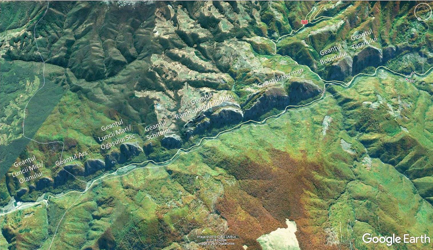geanț = creastă calcaroasă cu diferite forme și numeroase abrupturi; denumire din zona mijlocie a Cernei