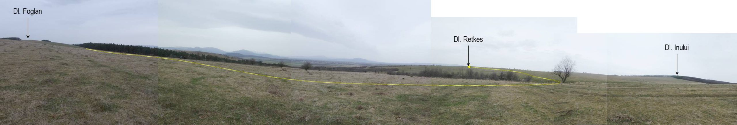 Trecem astfel prin șaua cea mai joasă a cumpenei de ape; să menționăm că marcajul bandă albastră nu urmărește aici cu strictețe linia morfologică a culmii principale, preferând, după cum am văzut, marginea pădurii de pe versantul nordic al Dealului Foglan și urcarea apoi pe Dl. Inului din valea Meszkatlanului.