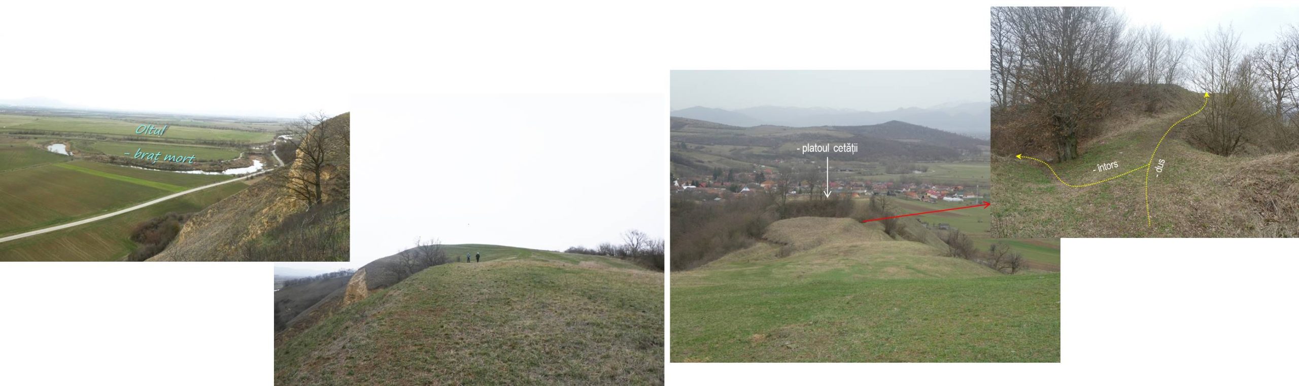 Brusc, culmea devine o muchie îngustă, tăiată de o șa atacată din ambele părți de eroziunea regresivă produsă de cele două păraie; se pare că șaua a fost antropic adâncită, realizându-se astfel un șanț de apărare al așezării ale cărei urme le vom vedea imediat ce ridicăm dâmbul ce urmează dincolo de șa …