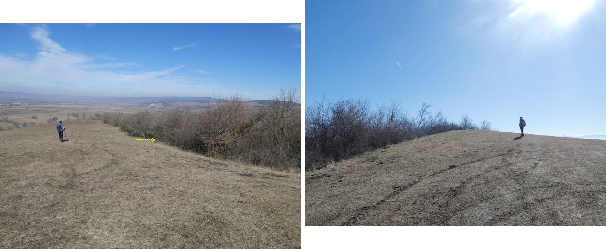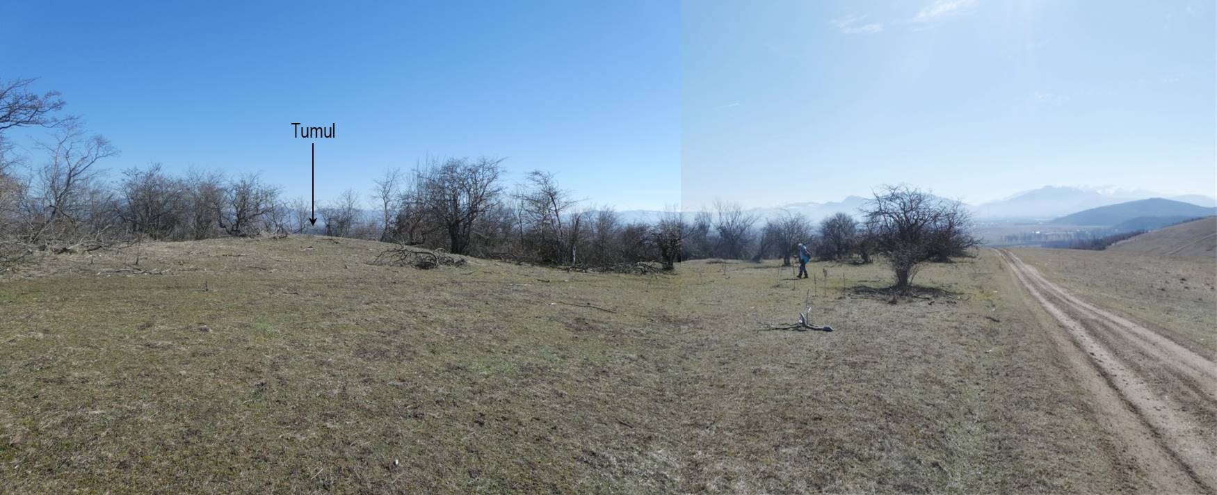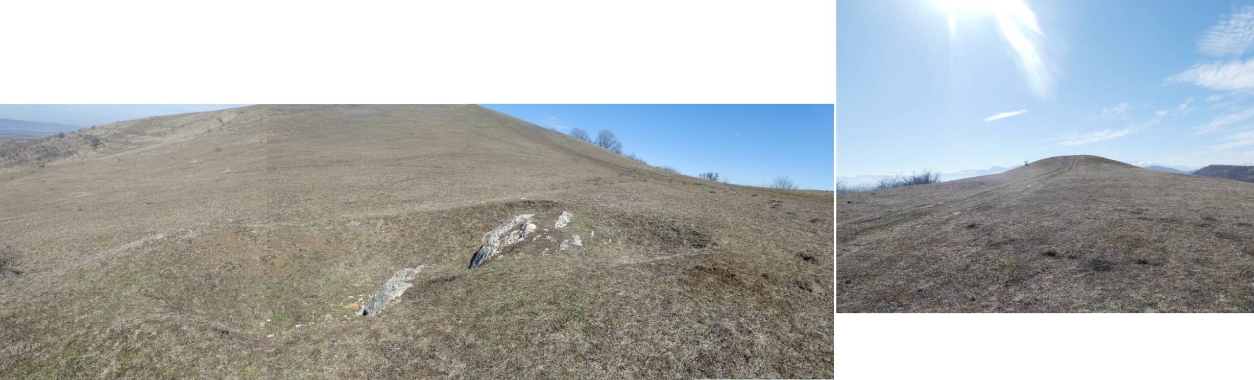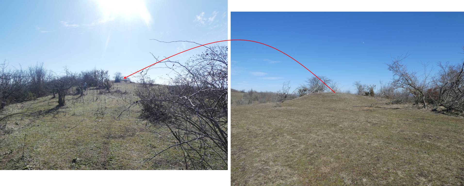 … se află câte un tumul; iar în șaua dintrei ei, o certă groapă antropică (poate rezervor de apă pluvială) !