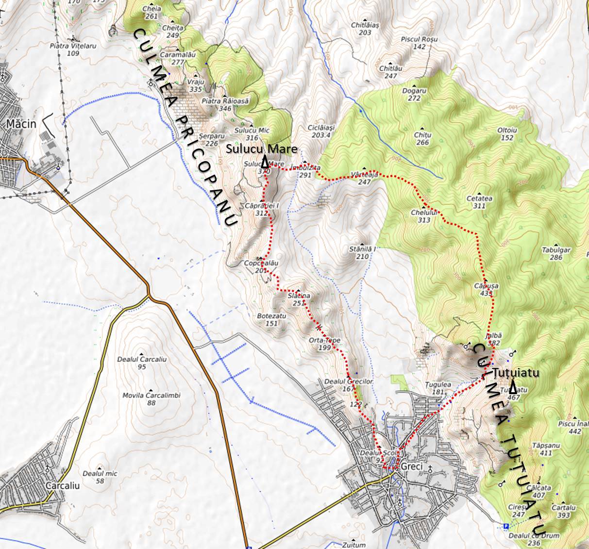 Legătura morfologică dintre Culmea Pricopanu și Culmea Țuțuiatu este realizată de Șaua dintre vârfurile Sulucu Mare și Îmbulzita, cumpănă de ape între văile Pricopanu (>Recea) și Valea cu Plopi (>Jijila). Un traseu … buclă, deschis și închis în localitatea Greci, realizează, turistic vorbind, veriga ce leagă cele două culmi. Acest traseu mai rezolvă însă și o chestiune de … periferie: străbate capetele, de regulă neglijate, ale celor două culmi majore menționate: cel extrem estic al Pricopanului și cel extrem vestic al Țuțuiatului; căci în epoca actuală a traseelor de o zi, facilitate de accesul auto la punctele de intrare/ieșire în/din ele, drumețiile pe cele două culmi exclud cele două capete pomenite !