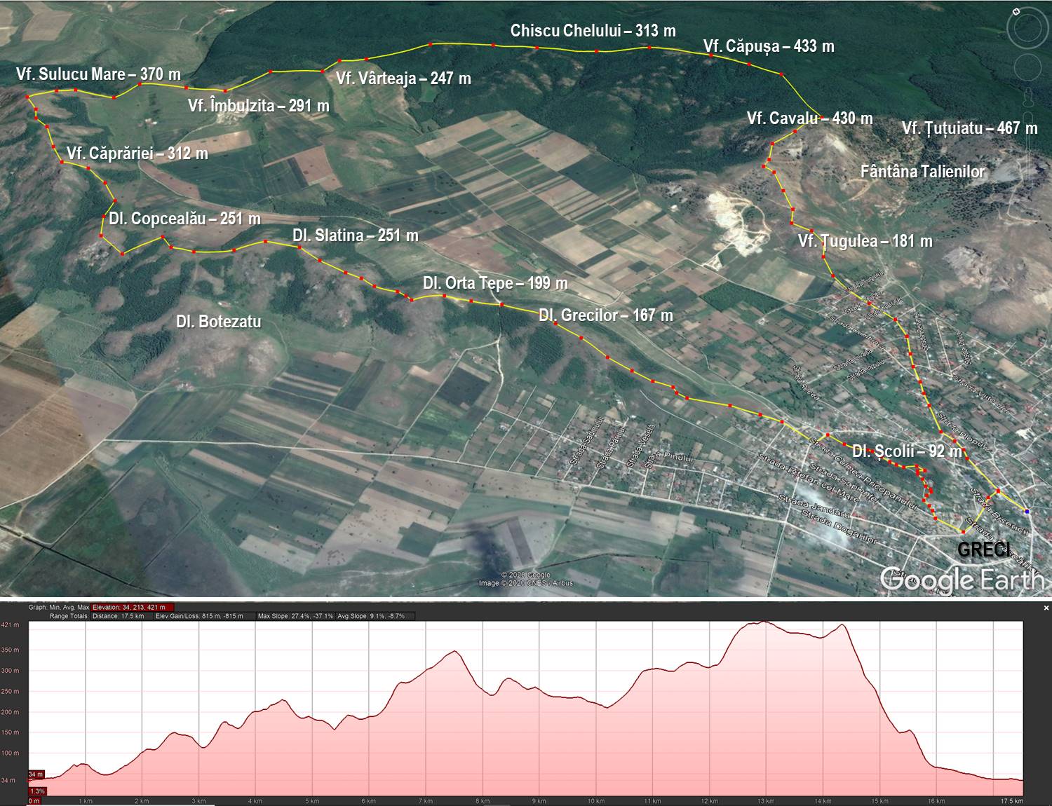 Traseul propus de noi (6 iunie 2020), Greci – Dl. Școlii – Dl. Grecilor – Dl. Slatina – Vf. Sulucu Mare – Dl. Îmbulzita – Chiscu Chelului – Dl. Căpușa – Dl. Cavalu – Dl. Țugulea – Greci, …