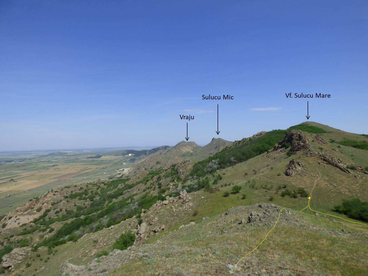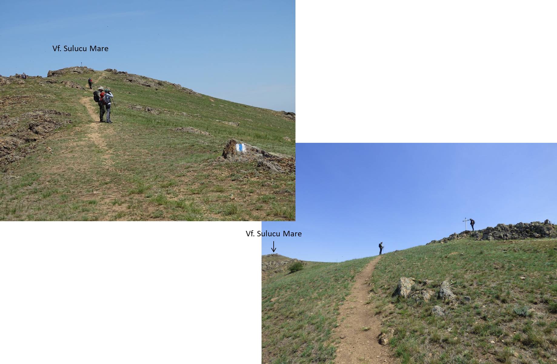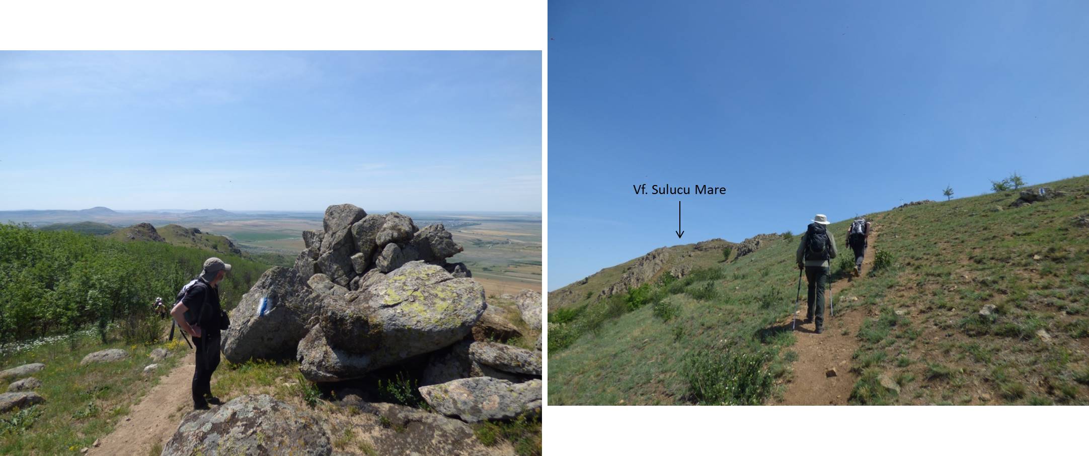 Odată îndeplinită și această formalitate – turul de orizont de pe Sulucul Mare, vârful cel mai înalt al Culmii Pricopanului – ne dăm drumul la vale spre șaua adâncă, largă, ce ne desparte de “sectorul Țuțuiatu” al Munților Măcin; …