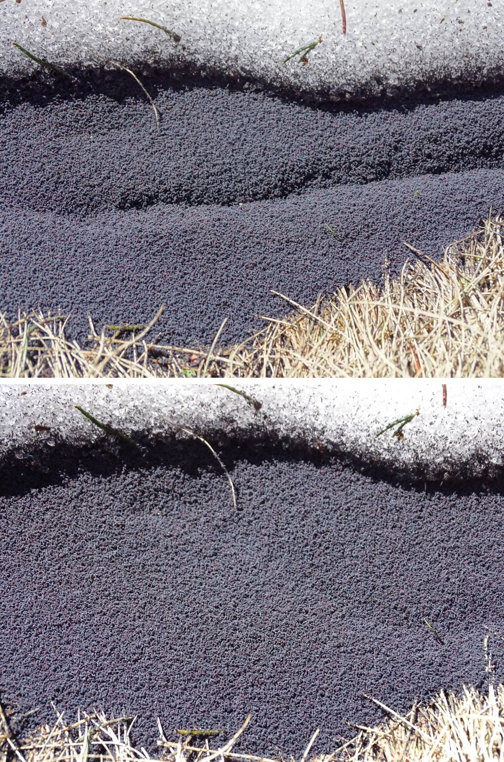 Compoziția e din mii și mii de insecte, mai precis, colembole, și mai precis, purici, popular, supranumiți “de zăpadă”, iar științific, Hypogastrura nivicola ! De culoare de la roșu la albastru-negricios, lungi de 2-3 mm, au 6 picioare și un apendice în formă de furcă care îi propulsează în salturi de ordinul centimetrilor (2-3 !). Cercetători canadieni au descoperit că rezistența lor la frig e datorată unor proteine antigel din structura lor biochimică, care blochează formarea cristalelor de gheață în organele lor; s-a deschis astfel un front de cercetare asupra posibilităților de ameliorare a condițiilor de transport și de conservare a organelor umane destinate transplanturilor chirurgicale !