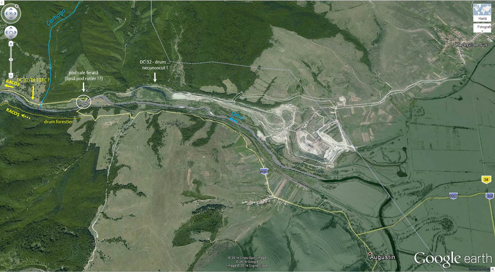 2. In realitate DJ 131C leaga Racosu de Sus de Racos, pe malul drept al Oltului (Google Maps mai are unele scapari!). Pe malul stang al Oltului exista un drum care leaga Augustin de Mateias. In urma cu cativa ani acesta a fost drum forestier dar in prezent este drum comunal deoarece bariera a fost desfiintata.