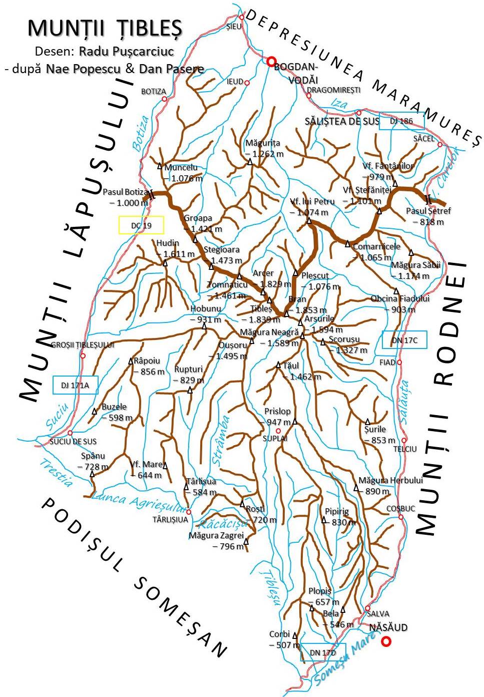 … hotarul cu Podișul Someșan – în cea mai mare parte cu Masivul/Culmea Preluca, o structură piemontană a Munților Lăpușului bine individualizată, formată din șisturi cristaline, cu o culme principală viguroasă, orientată transversal în raport cu ramurile sudice ale lor – este realizat de văile Suciu, Dobric – între confluențele cu Lăpușul și Teiu -, Teiu – până la o obârșie a sa din nordul Vârfului Pietriș – și Bloaja.
