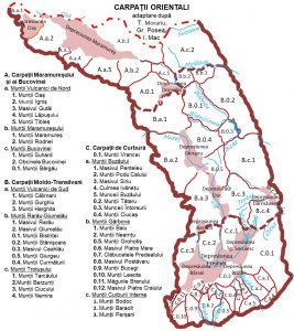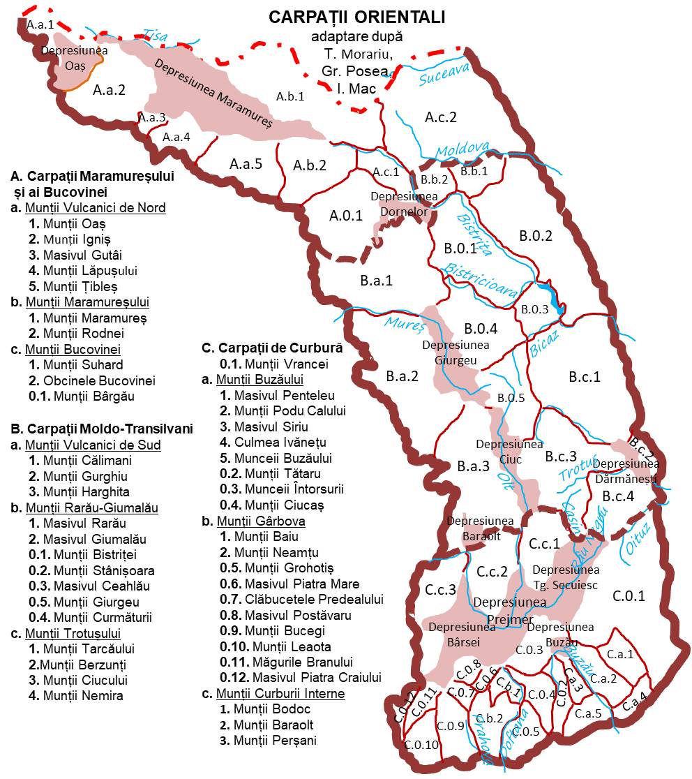 CARPAȚII ORIENTALI – subdiviziuni(* [adaptare după T. Morariu, Gr. Posea, I. Mac (1980),  Grigore Posea, Lucian Badea (1984)]