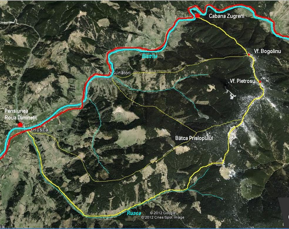 Privind noi, eu și Marius Gîrcineanu, din mai multe poziții de pe Piciorul Ruscăi, vis-a vis, spre interfluviul Sunători-Bistrița, am afirma (nu vrem să vă supărăm!) că urcarea pe vf. Bogolinu din capătul muchiei interfluviului respectiv este foarte dificilă (afirmația poate fi susținută cu câteva fotografii). De asemenea, urcarea din Valea Sunători pe muchie nu-i ușoară de loc! Mai povestim cănd ne vedem! Ne-am uitat cu atenție la interfluviu fiind avizați după citirea acestei descrieri, dar și după vizionarea fotoreportajului!
