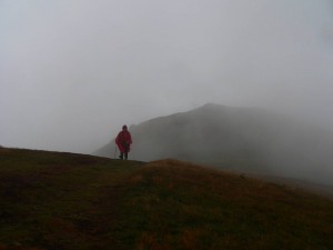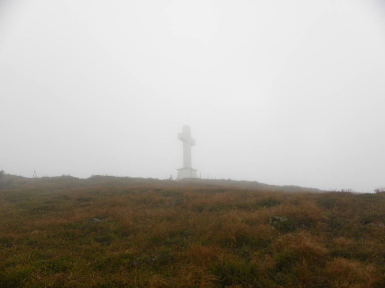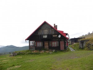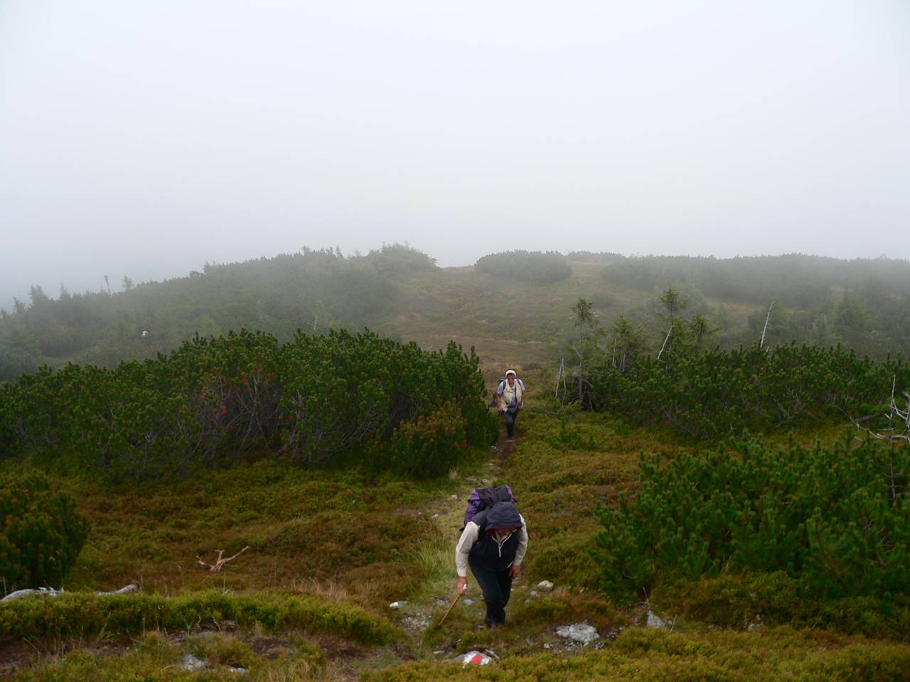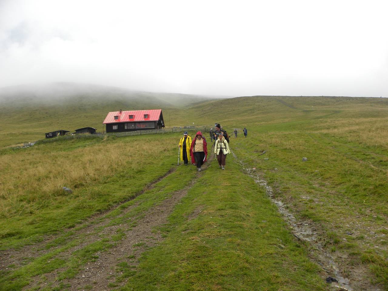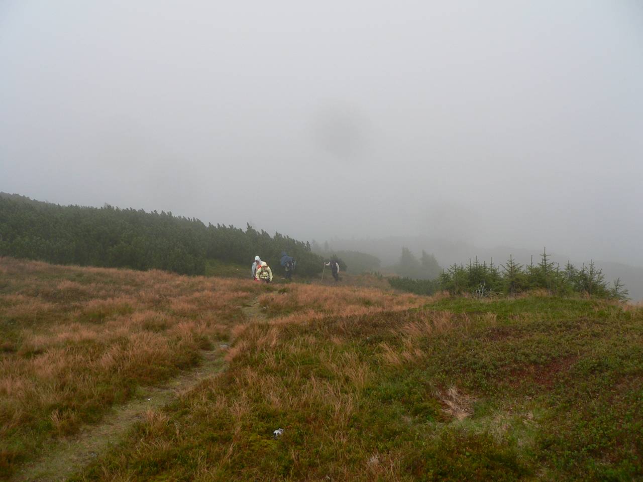 Se retrage şi ceaţa; în faţă, Cabana Giumalău şi Piciorul Rusca pe care ar trebui să coborâm în continuare !