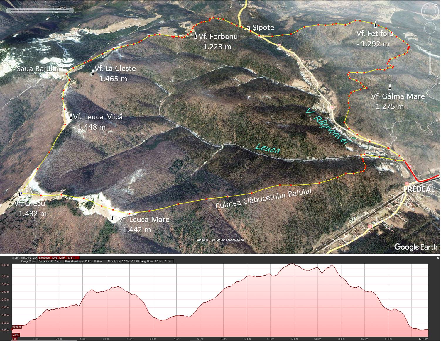 Traseu: PREDEAL (Valea Râșnoavei-Monumentul Eroilor) – pe sub Mt. Gâlma Mare – Vf. Fetifoiu – La Șipote – Mt. Forban – Șaua Baiului – Vf. Leuca Mică – Vf. Grecu – Vf. Leuca Mare – Culmea Clăbucetului Baiului – Monumentul Eroilor