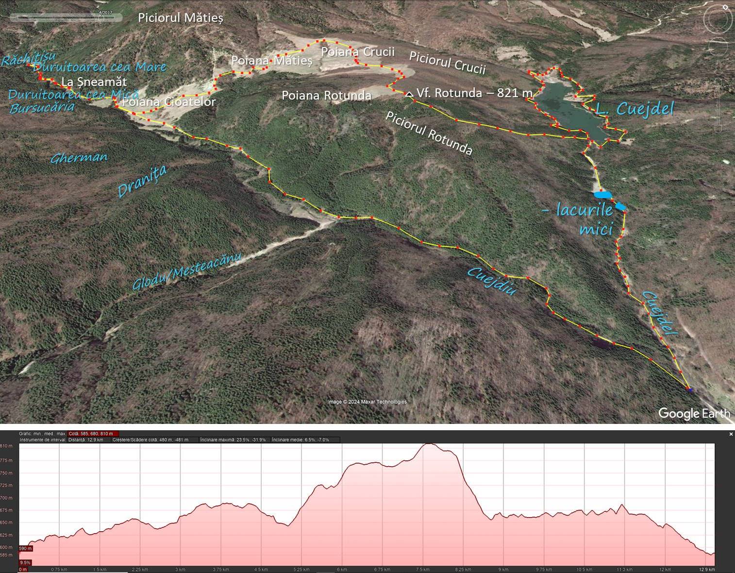Traseu: Gura Cuejdelului – Valea Cuejdi – Gura Bursucăriei – Duruitoarea cea Mică – Gura Răchitișului – Duruitoarea cea Mare – Poiana Cioatelor – Poiana Mătieș – Poiana Crucii – Poiana Rotunda – Barajul Lacului Cuejdel – Turul lacului Cuejdel – Valea Cuejdelului – Lacurile Mici – Gura Cuejdelului