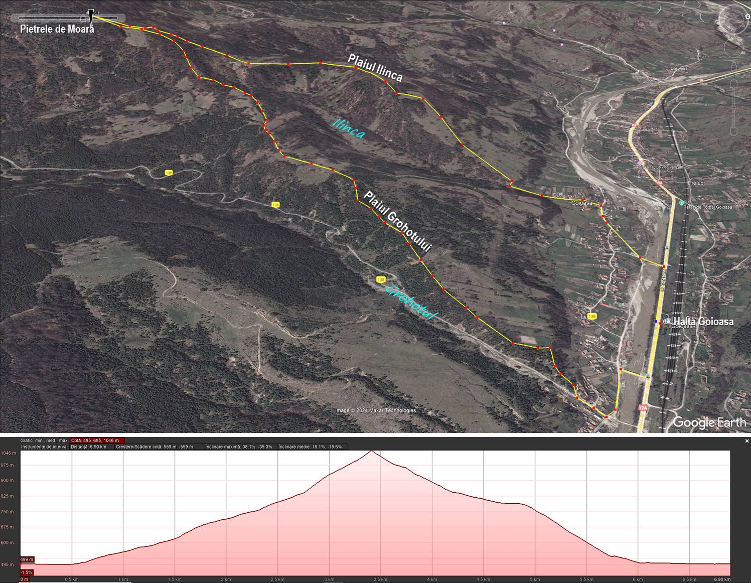Traseu: Halta Goioasa – Gura Grohotului – Piciorul Grohotului – Pietrele de Moară – Piciorul Ilincăi – Gura Ilincăi – Halta Goioasa