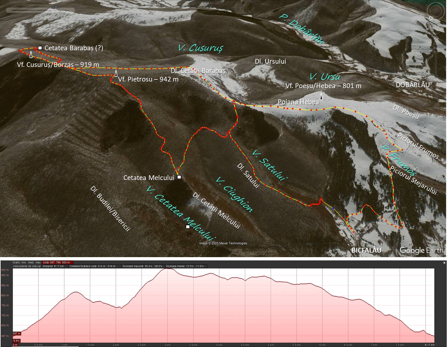 Traseu: BICFALĂU – Gura Văii Satului – Dealul Cetății – Cetatea Melcului – Vf. Pietrosu – Vf. Cusuruș – Cetatea Barabaș – Dl. Cetății Barabaș – Poiana Hebea – Vf. Poeșu – Piciorul Frumos – Piciorul Stejarului – BICFALĂU