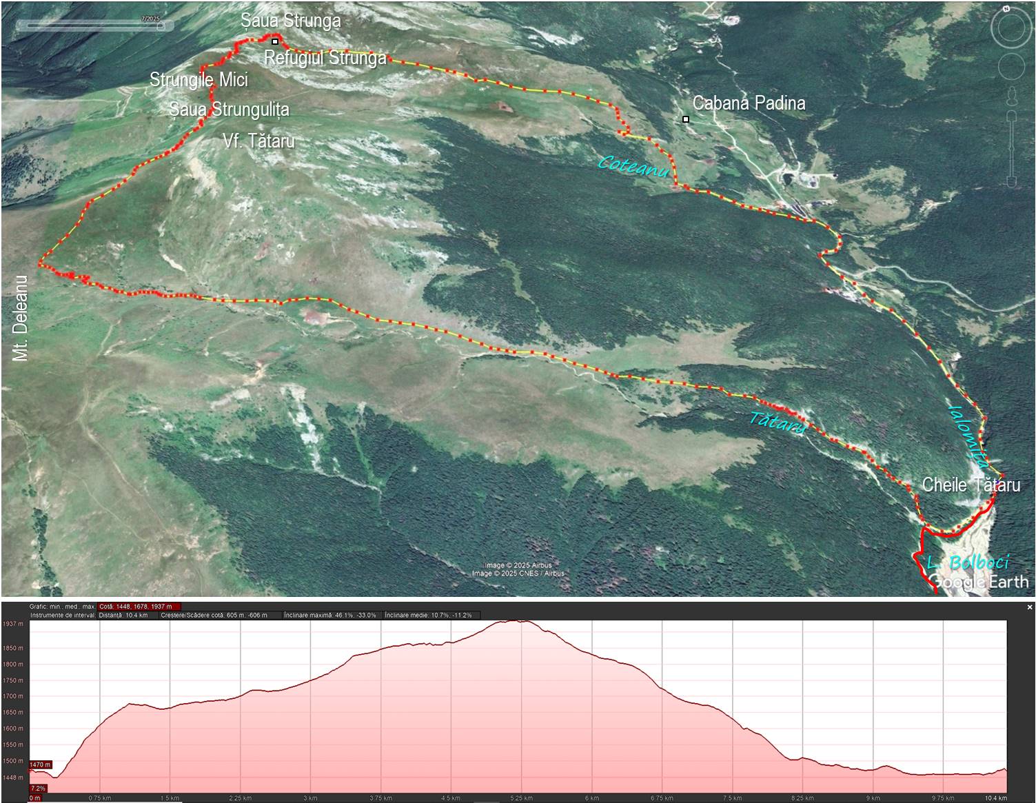 Traseu: Cheile Tătarului (Valea Ialomiței) – Valea Tătarului – Mt. Deleanu – Mt. Tătaru – Șaua Strungulița – Refugiul Strunga – Valea Ialomiței – Cheile Tătarului