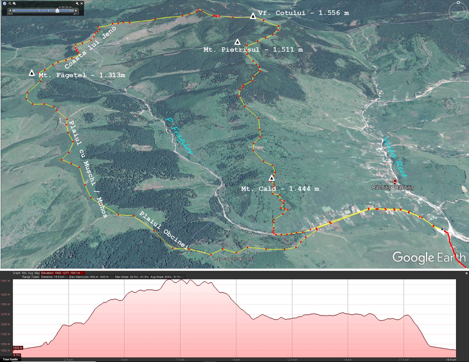 Traseu: Răchitiș – Mt. Cald – Mt. Pietrișu – Vf. Cotului – Coasta lui Jenö – Mt. Făgețel – Culmea cu Mușchi – Culmea Obcinei – Răchitiș