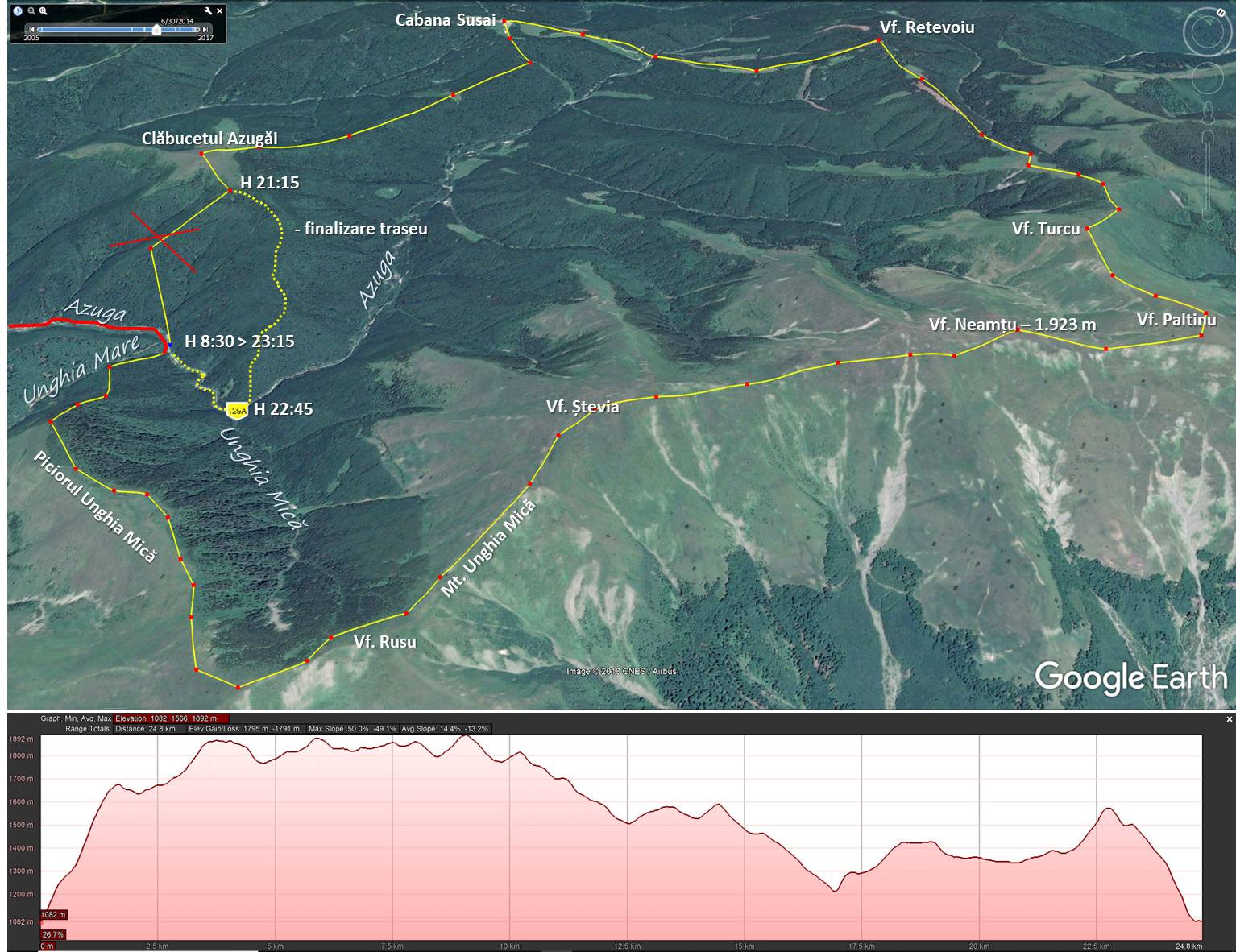 Traseu: Valea Azuga (Gura Unghiei Mari) – Piciorul Unghiei Mici – Mt. Rusu – Mt. Șteviei – Vf. Neamțu – Vf. Paltinu – Vf. Turcu – Vf. Retevoiu – Valea Azuga – Cabana Susai – Clăbucetul Azugăi – Gura Unghiei Mici – Gura Unghiei Mari