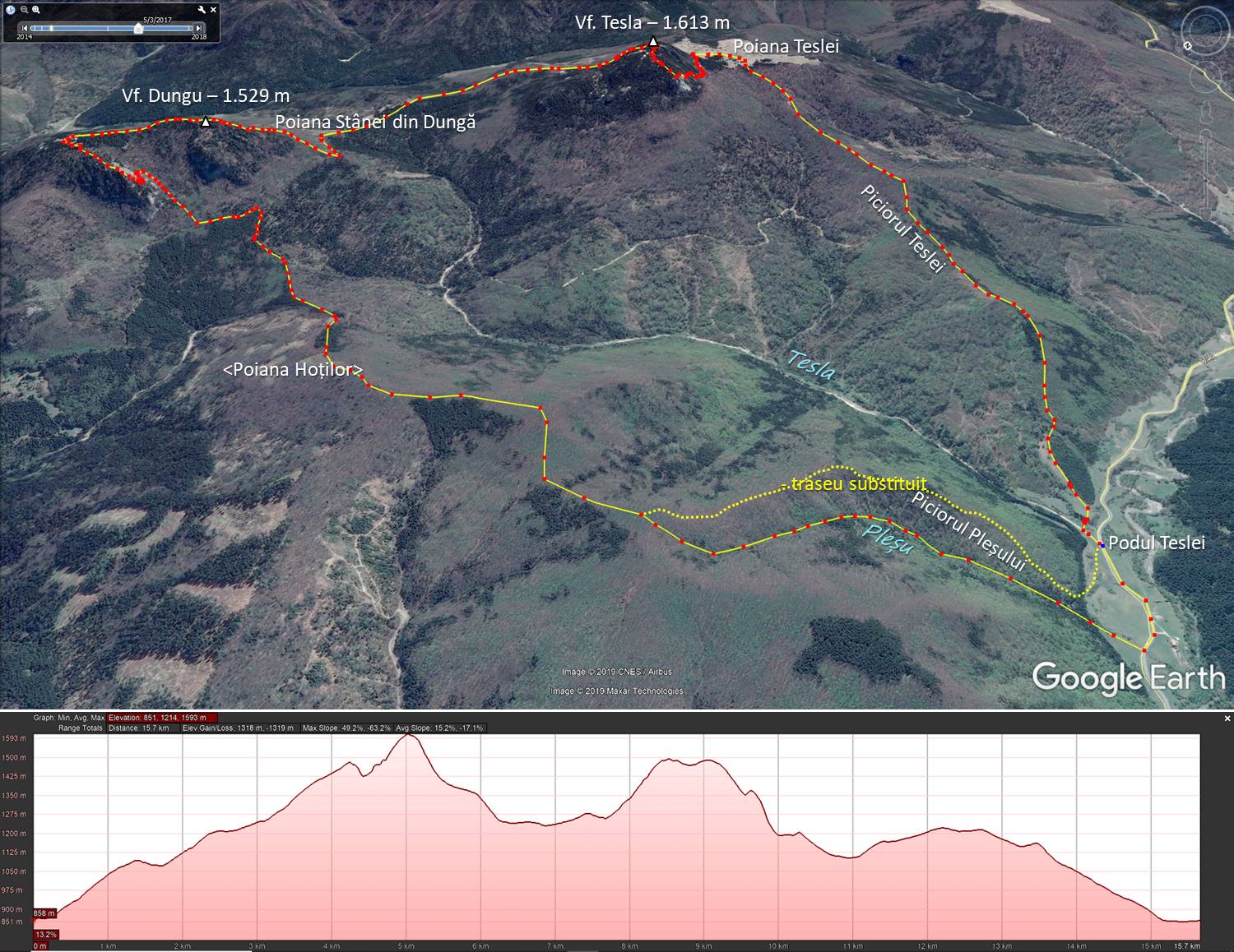 Traseu: Podul Teslei – Piciorul Teslei – Poiana Teslei – Vf. Tesla – Poiana Stânei din Dungă – Vf. Dungu – Poiana Hoțului – Valea Pleșului – Podul Teslei