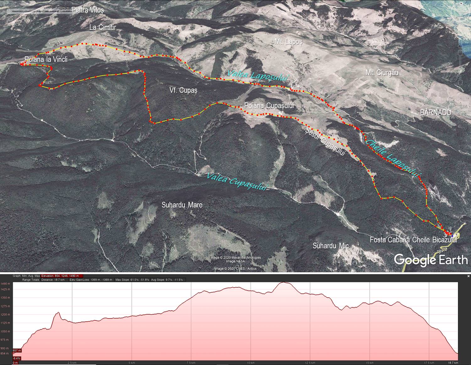 Traseu: Cheile Bicazului (Fosta Cabană Cheile Bicazului) – Cheile Lapoșului – Valea Lapoșului – Poiana La Vincli – Mt. Cupaș – Poiana Cupașului – Șesul Cupașului – Fosta cabană Cheile Bicazului