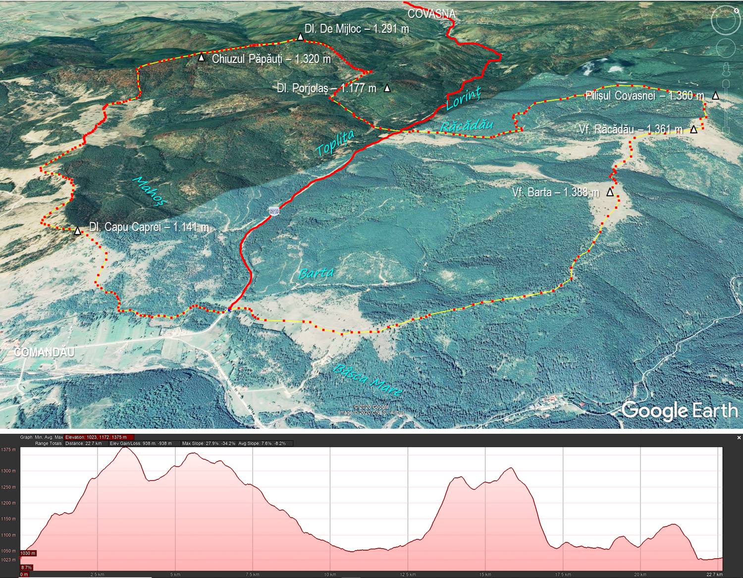 Traseu: Comandău (Gura Bartei) – Vf. Barta – Vf. Răcădău – Pilișul Covasnei – Valea Porjolaș – Dl. De Mijloc – Chiuzul Păpăuți – Dl. Capu Caprei – Gura Bartei