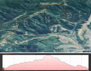 Traseu: Brețcu (benzinărie) – Dl. cu Sâmburi – Pasul Oituz – Dl. Cioara – Dl. Lin – Dl. Săcădat – Mt. Negru – P. Întortochiat – Dl. Chirilău – Benzinărie