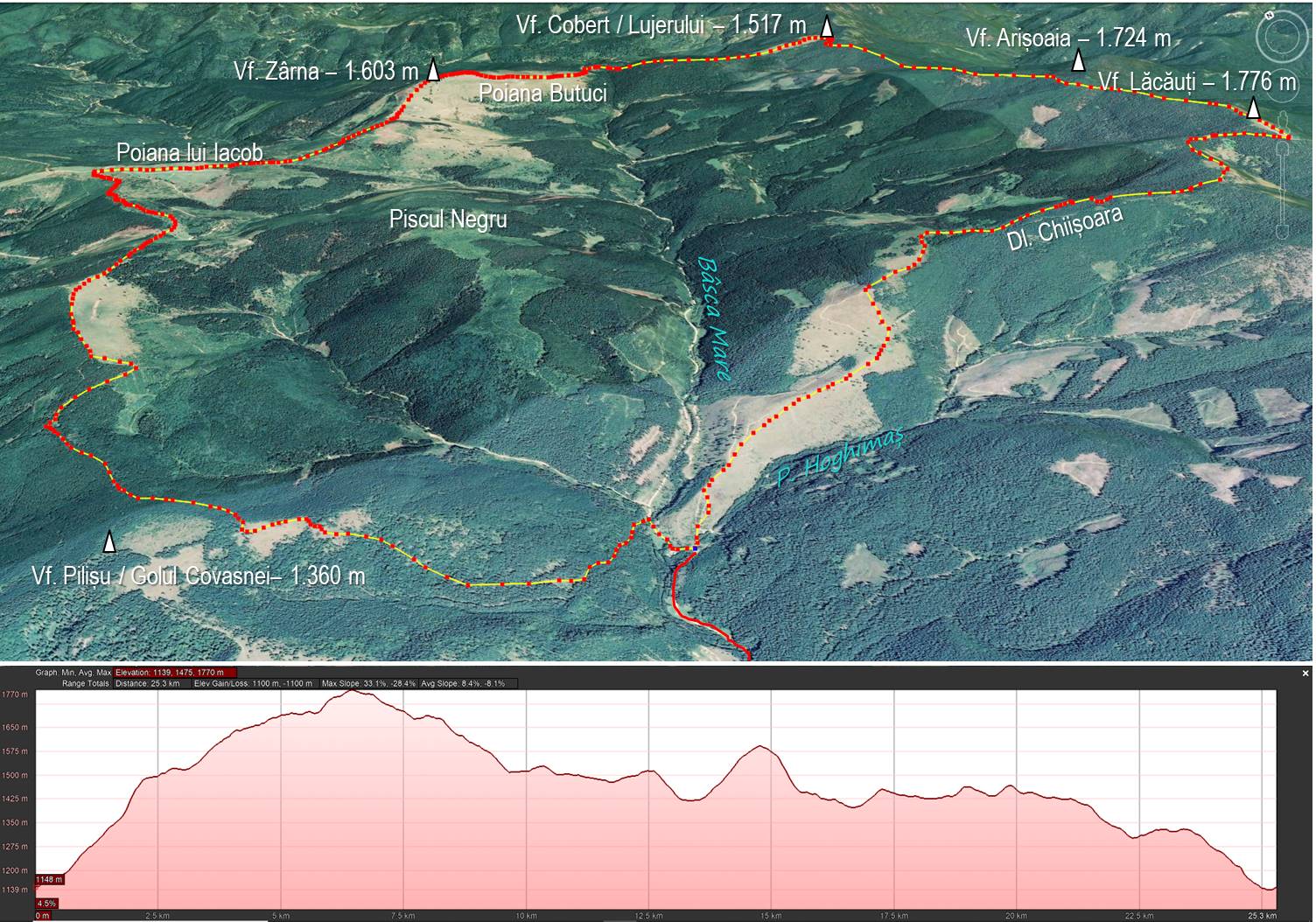 Traseu: Comandău (Gura Hoghimașului) – Dl. Chiișoara – Vf. Lăcăuți – Vf. Arișoaia – Poiana Lujerului – Vf. Zârna – Poiana lui Iacob – Pilișul Covasnei – Gura Hoghimașului