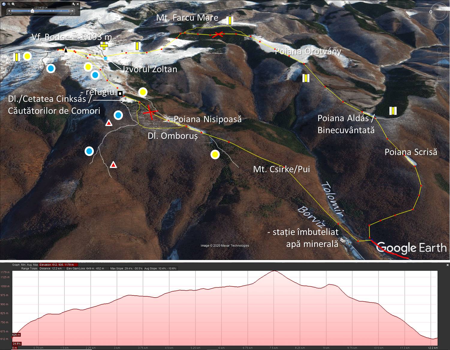 Traseu: Bodoc (Valea Tolomir: N45.966032; E25.876022) – Poiana Aldaș – Dl. Orotvani – Poiana lui Zoltan – Vf. Bodoc – Dl. Chinciaș – Dl. Omboruș – Poiana Nisipoasă – Mt. Cirche – Valea Tolomir