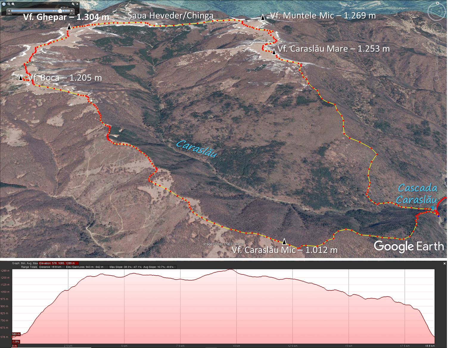 Traseu: Gura Caraslăului – Cascada Caraslău – Vf. Caraslău Mare – Muntele Mic – Șaua Heveder – Vf. Ghepar – Vf. Boca – Vf. Caraslău Mic – Gura Caraslăului