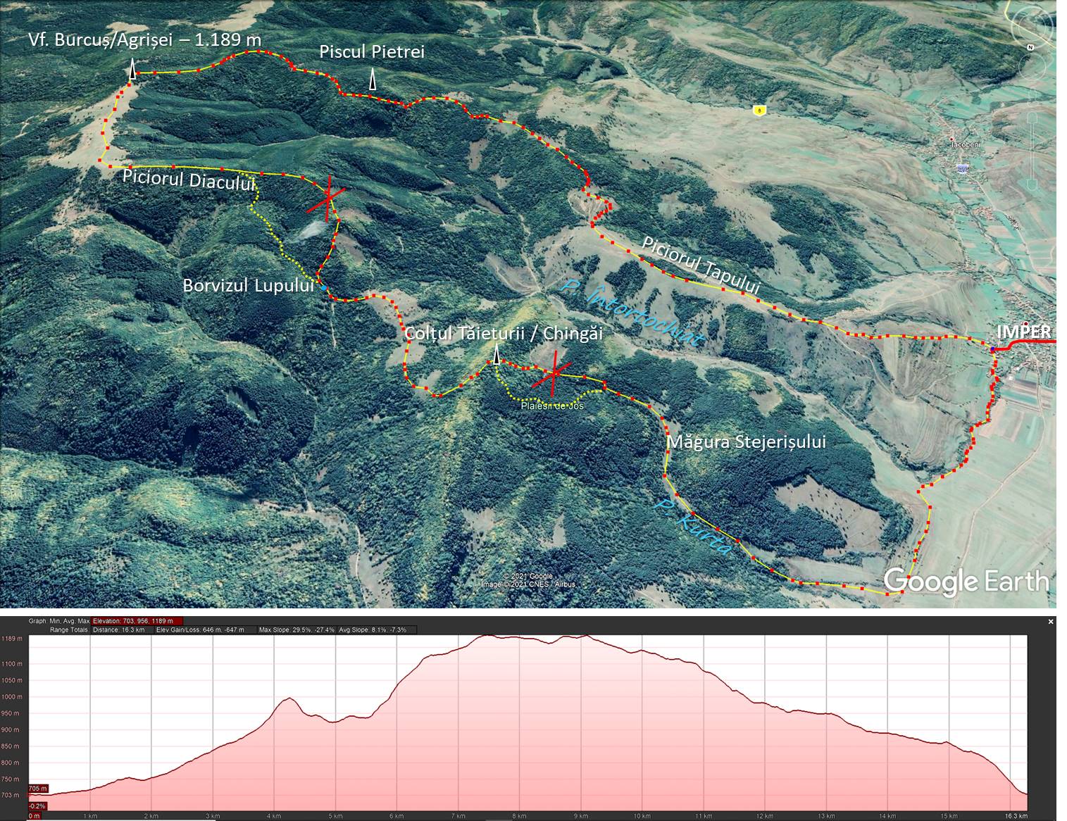 Traseu: Imper – Valea Kurta – Colțul Tăieturii – Piciorul Diacului – Vf. Agrișei – Piscul Pietrei – Piciorul Țapului – Imper