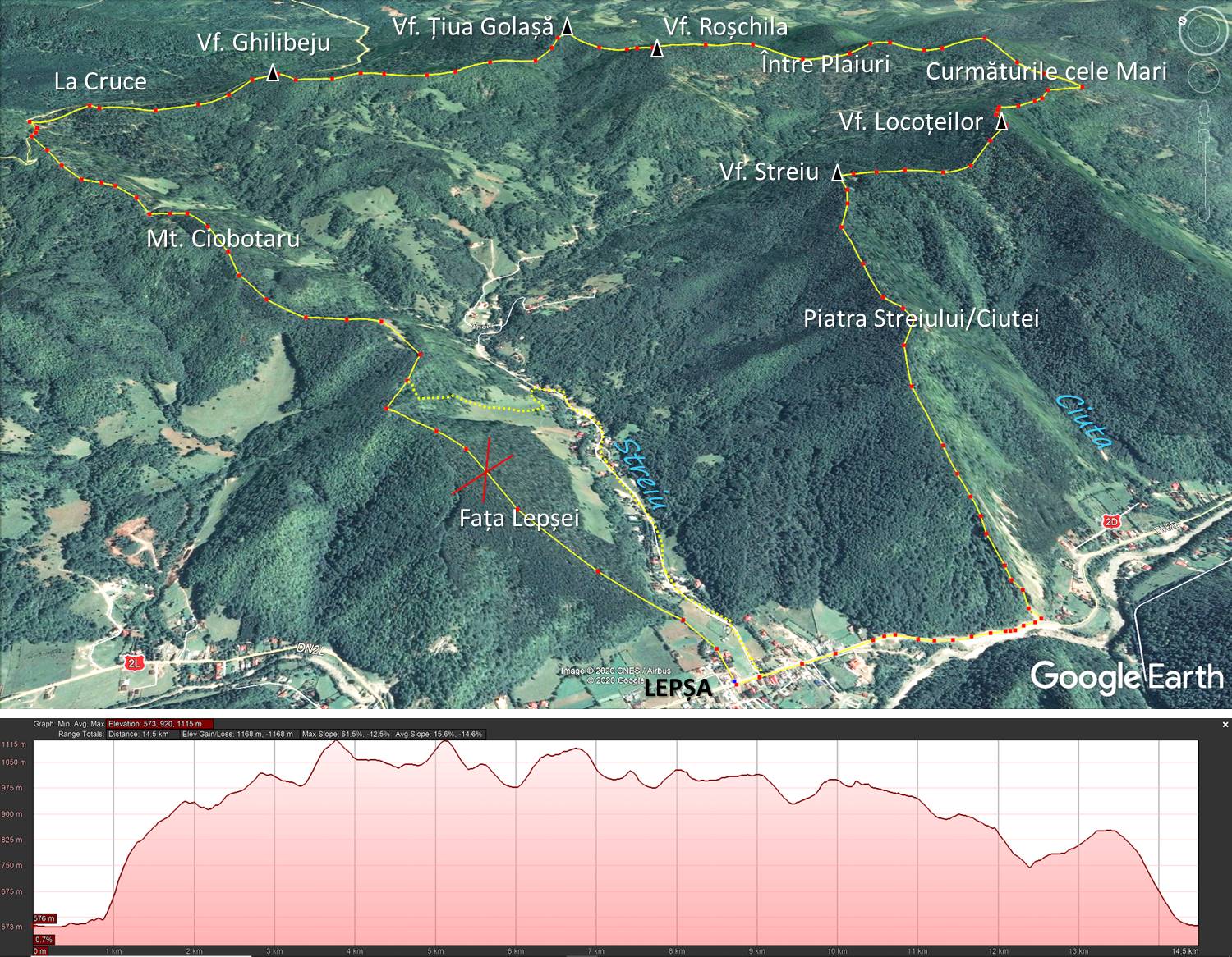 Traseu: Lepșa (Gura Streiului) – Piatra Ciutei – Vf. Streiu – Vf. Locoțeilor – Curmăturile cele Mari – Între Plaiuri – Mt. Roșchila – Vf. Țiua Golașă – Mt. Ghilibeju – La Cruce – Mt. Ciobotaru – Sat Streiu – Gura Streiului