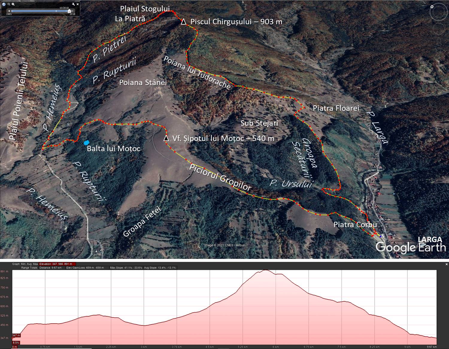 Traseu: LARGA – Piatra Corbu – Piciorul Gropilor – Vf. Șipotul lui Moțoc – Balta lui Moțoc – Valea Rupturii – Valea Hemeiuși – Valea Pietrei – La Piatră – Plaiul Stogului – Vf. Chirgușului – Poiana lui Toderică – Plaiul Chicirei – LARGA