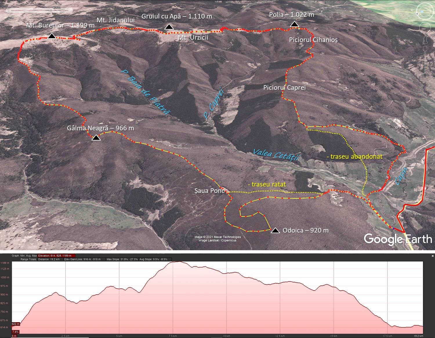 Traseu: Catroșa (Gura Pârâului Cetății) – Vf. Odoica – Șaua Ponc – Gâlma Neagră- Mt. Bureților – Mt. Jidanului – Gruiul cu Apă – Vf. Polia – Piciorul Cihanioș – Piciorul Caprei – Gura Pârâului Cetății