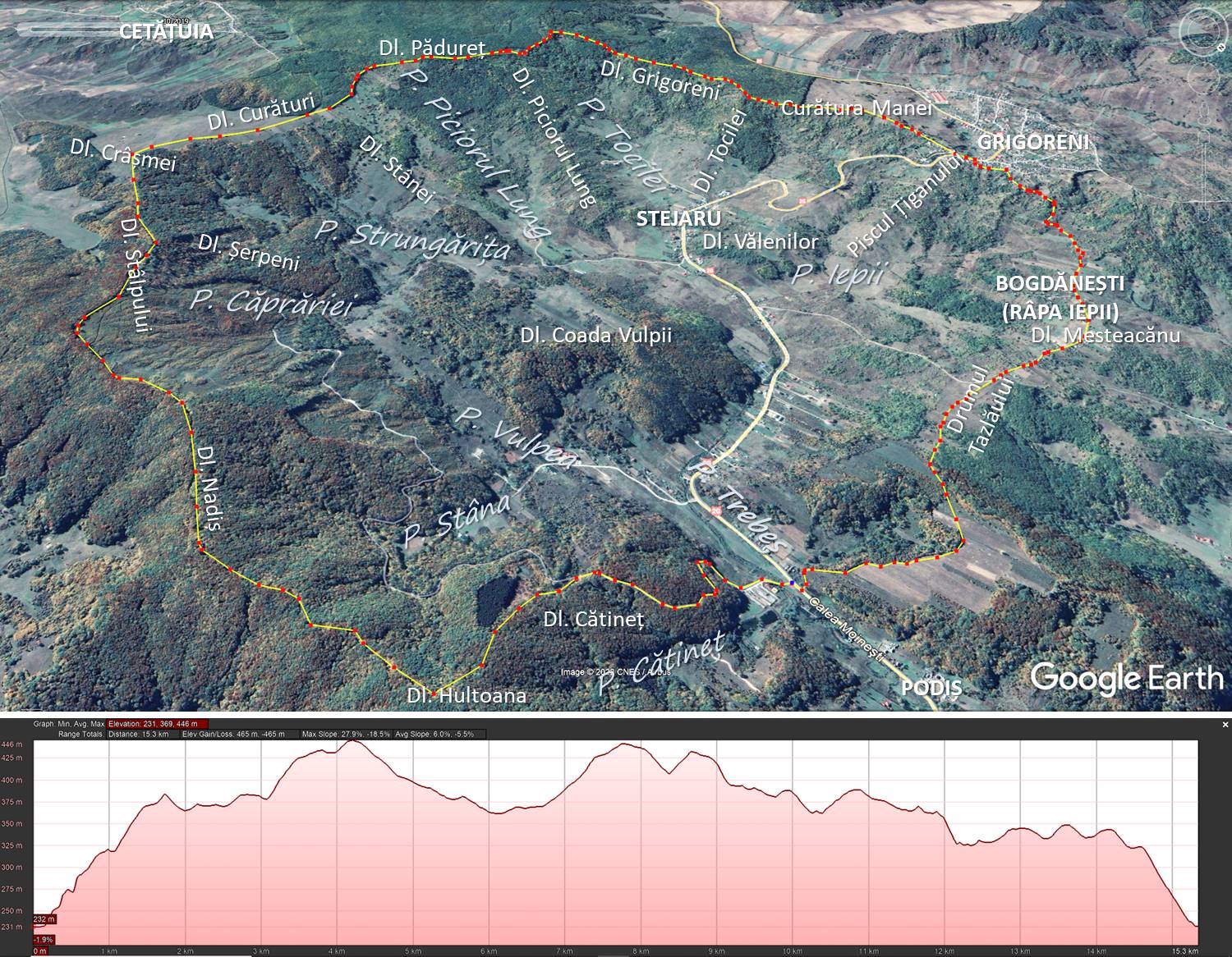 Traseu: PODIȘ (Gura DF Cătineț) – Dl. Cătineț – Dl. Hultoana – Dl. Nadiș – Dl. Stâlpului – Dl. Crișmei – Dl. Curături – Dl. Pădureț – Dl. Grigoreni – Curătura Manei – GRIGORENI – Dl. Mesteacăn – BOGDĂNEȘTI – Drumul Tazlăului – Gura Cătinețului