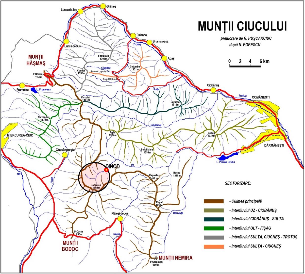 Traseu: CINOD – Gura Văii Casa Paznicului – Culmea Jghiabului – Cătunul LESÖDIEK – Gâlma Bradului – Mt. Györöd – Mt. Botei – Pasul Uz – Mt. Rugat – Mt. Cicinda – Valea Broasca – Mt. Corocea – Culmea lui Andrei – Mt. Frunții – Mt. Cinod – Culmea Leneșu – CINOD