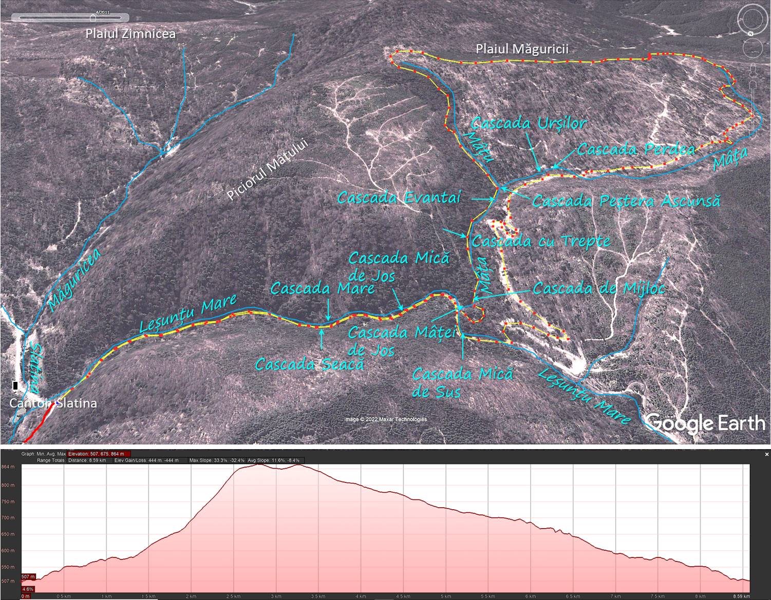 Traseu: LEȘUNȚ (Cantonul Slatina) – Valea Leșunțul Mare (Cascada Seacă, Cascada Mare, Cascadele Mici) – Valea Mâței Mari (Cascadele de Jos, Cascada de Mijloc, Cascada cu Trepte, Cascada Evantai, Cascada Peștera Ascunsă, Cascada Urșilor, Cascada Perdea) – Plaiul Măguricii – Obârșia Mâței Mari – Valea Mâței Mari – Valea Leșunțu Mare – Canton Slatina