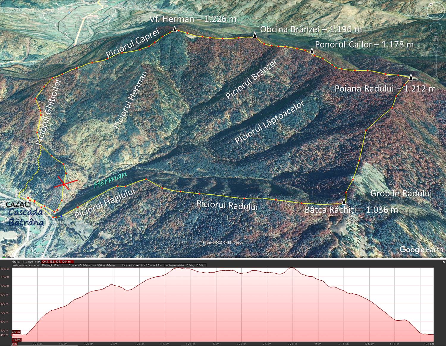 Traseu: CAZACI – Piciorul Hagiului – Piciorul Radului – Bâtca Răchiți – Poiana Radului – Ponorul Cailor – Obcina Brânzei – Vf. Herman – Piciorul Caprei – Piciorul Ghitioilor – CAZACI