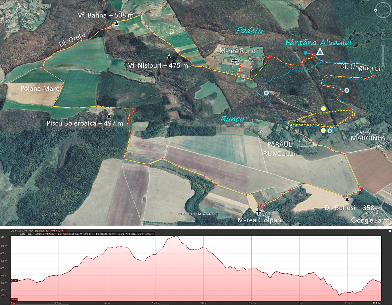 Traseu: Buhuși (Dl. Buhuși) – M-rea Ciolpani – Piscu Boieroaica – Poiana Mare – Dl. Orețu – Vf. Bahna – Dl. Nisipuri – M-rea Runc – Fântâna Alunului – Via Runc – Dl. Buhuși