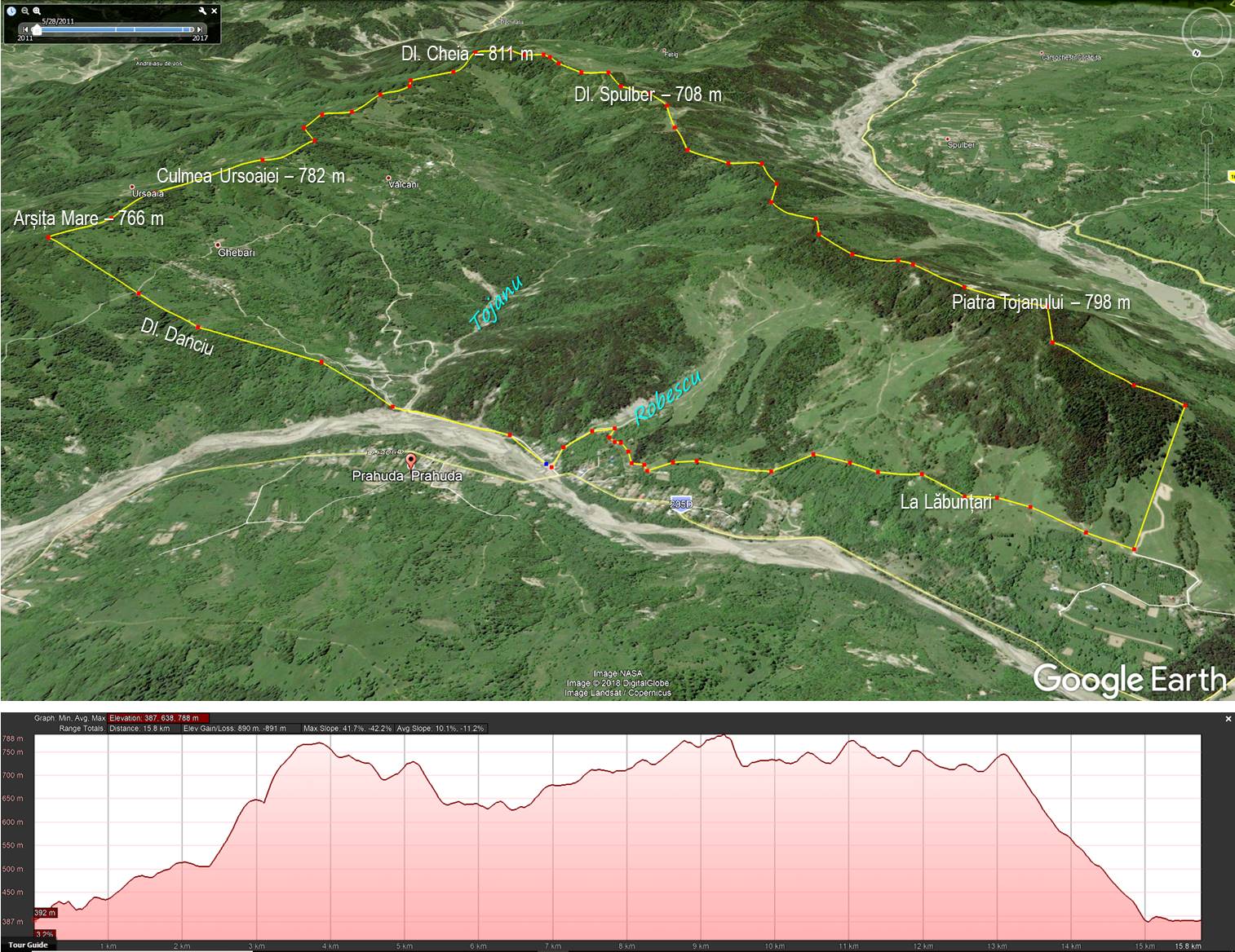 Traseu: Prahuda (Gura Robescului) – La Lăbunțari – Piatra Tojanului – Dl. Spulber – Dl. Cheia – Culmea Ursoaiei – Dl. Arșița Mare – Dl. Danciu – Gura Tojanului – Gura Robescului